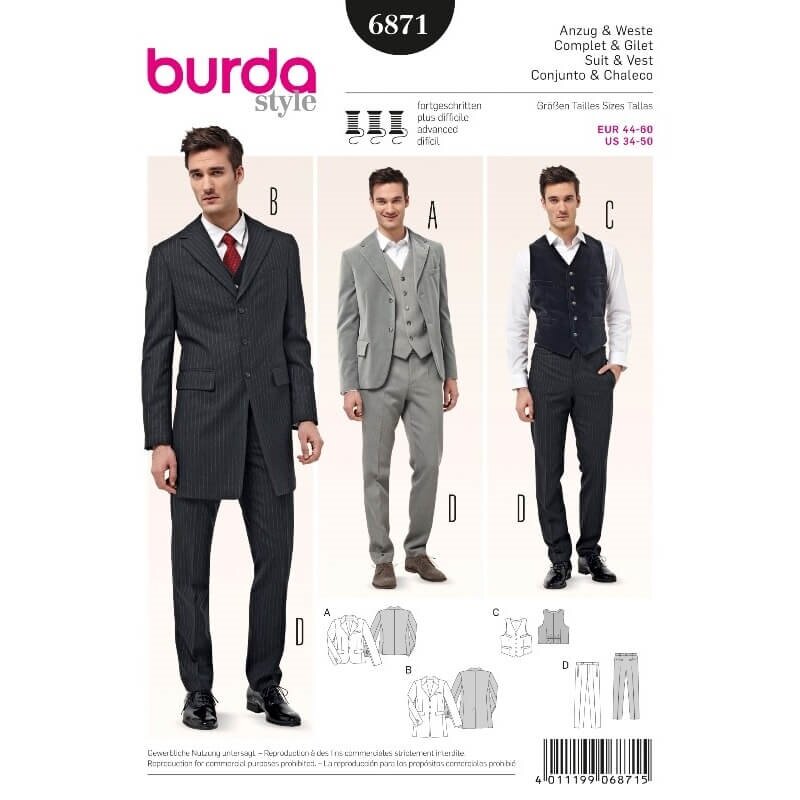 obchod@raj-sitia.skStrih Burda čierny 6871 - pánsky oblek celok - sako, vesta, nohavice s pukmi je súbor strihov pre ušitie pánske obleku - saká, vesty a nohavíc s pukmi. Strihy sú vytlačené na kvalitnom kriedovom papieri. Súbor obsahuje strihy pre ušitie pánskeho obleku - saká, vesty a nohavíc s pukmi. Získate originálne modely pre pánsky šatník.