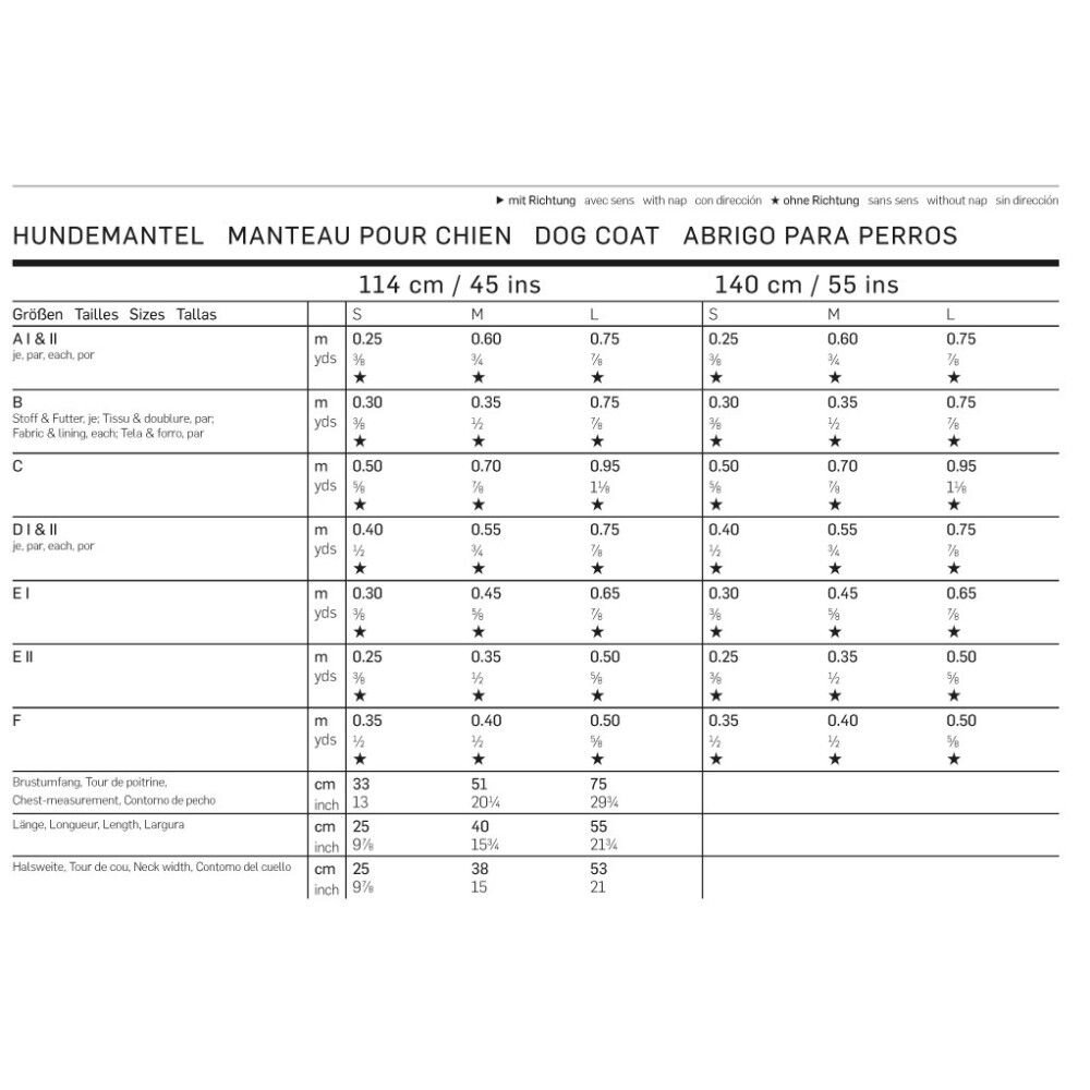 Strihy sú v jednotnej veľkosti s prídavkami na švy, úroveň obtiažnosti šitia: 2 (ľahká), odporúčané látky: bavlna, vlnené látky, fleece, džersej, koženka.