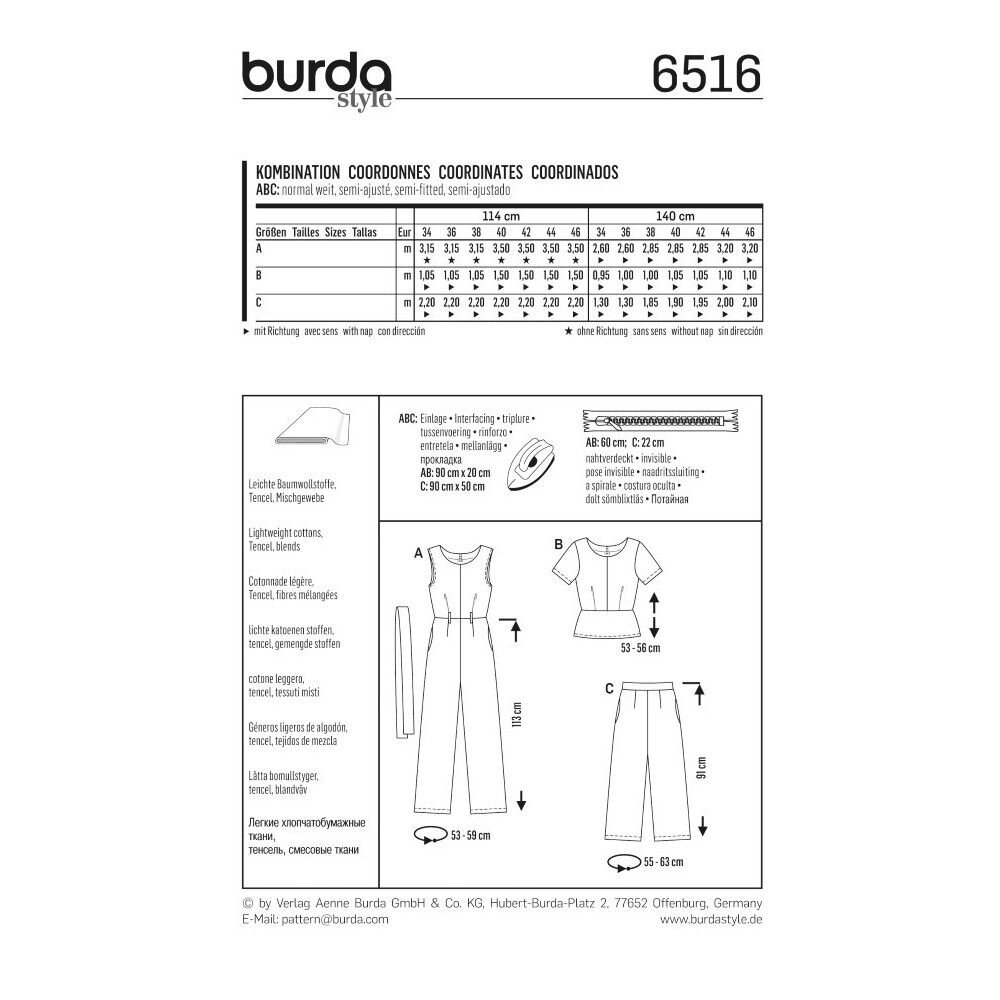 obchod@raj-sitia.skStrih Burda modrý 6516 - overal a nohavice so širokými nohavicami a jednoduchý top peplum je súbor strihov pre ušitie elegantného overalu so širokými nohavicami, samostatných nohavíc so širokými nohavicami a peplum topu. Strihy sú vytlačené na kvalitnom kriedovom papieri. Vďaka jednoduchému strihu, podľa ktorého zvládnu šiť aj začiatočníci, získate originálne modely do spoločnosti a napríklad aj na ples a iné spoločenské akcie.