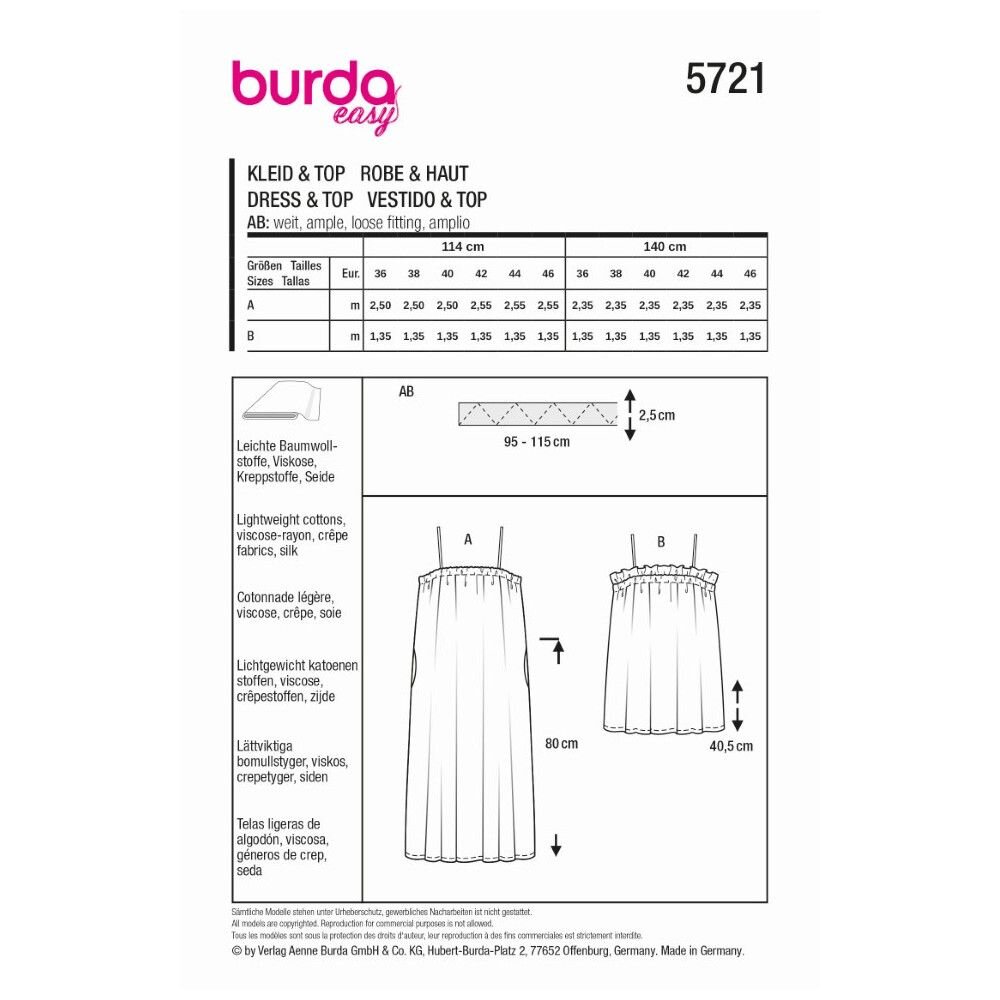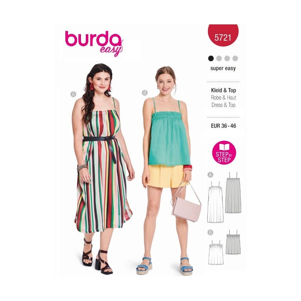 obchod@raj-sitia.skStrih Burda zelený 5721 - voľné šaty na ramienka, top na ramienka, plážové šaty je súbor strihov na ušitie dámskeho letného oblečenia. Strihy sú vytlačené na kvalitnom kriedovom papieri. Vďaka jednoduchému strihu, podľa ktorého zvládnu šiť aj začiatočníci, získate originálne modely pre Váš šatník.