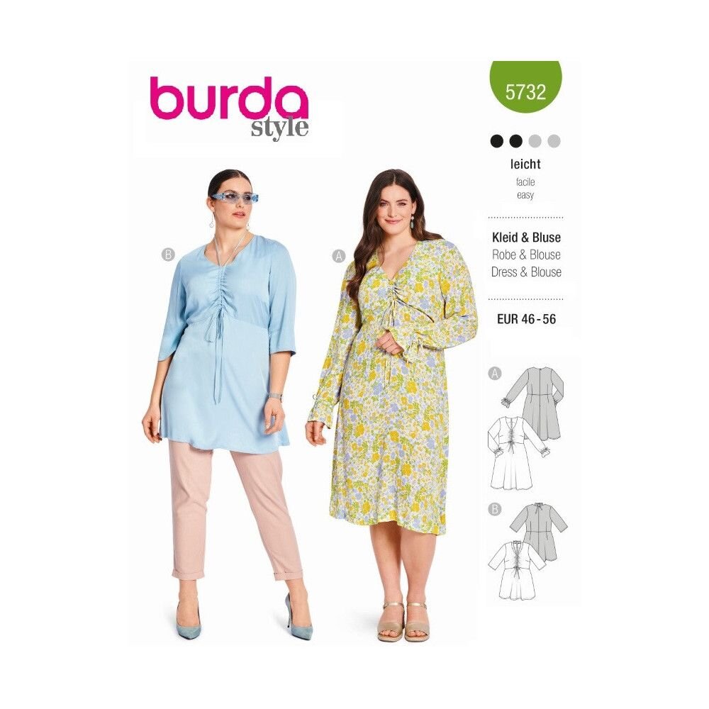 obchod@raj-sitia.skStrih Burda zelený 5732 - šaty so sťahovaním, tunika pre plnoštíhle je súbor strihov na ušitie pohodlných šiat so sťahovaním a pohodlné tuniky. Strihy sú vytlačené na kvalitnom kriedovom papieri. Vďaka jednoduchému strihu, podľa ktorého zvládnu šiť aj začiatočníci, získate originálne modely pre Váš šatník.