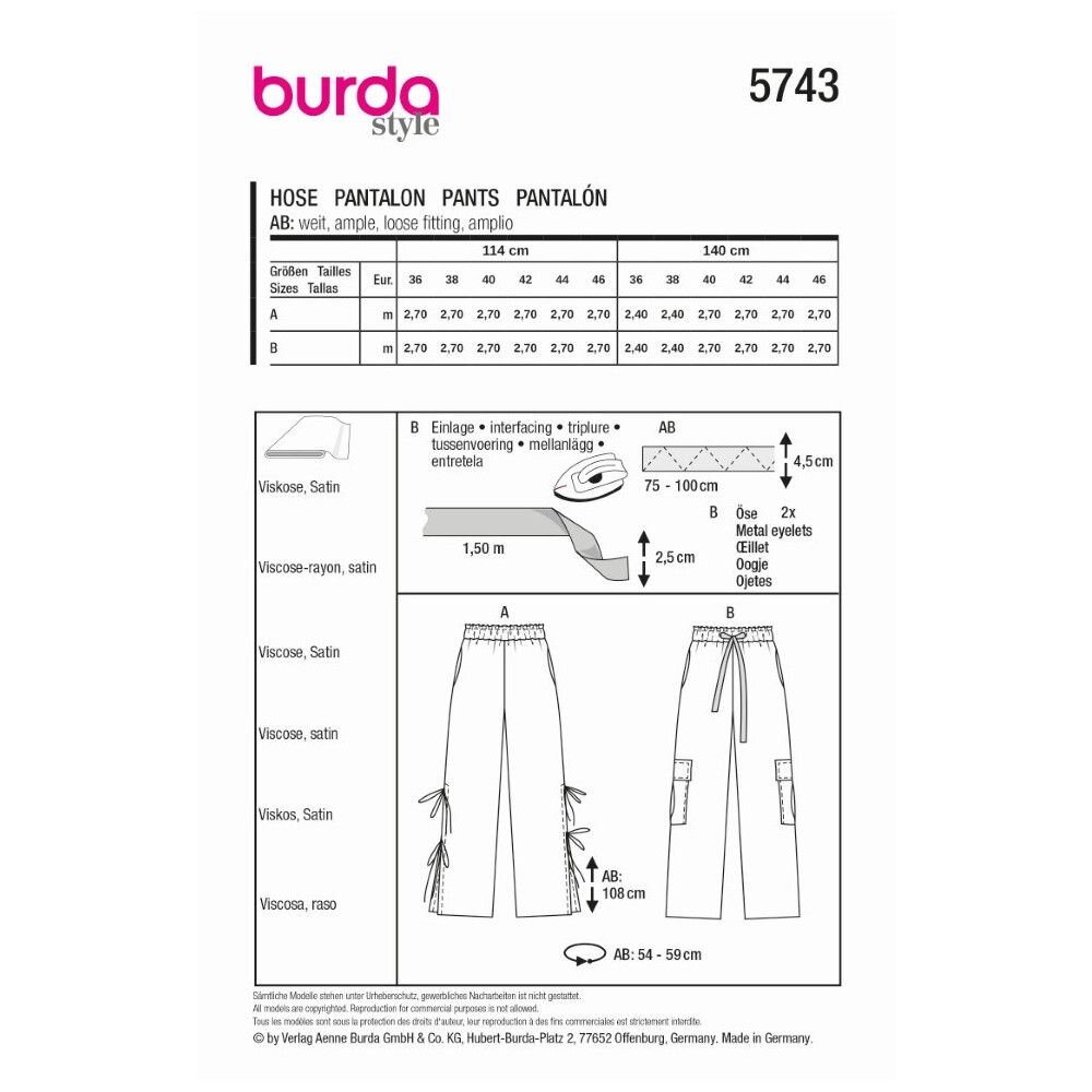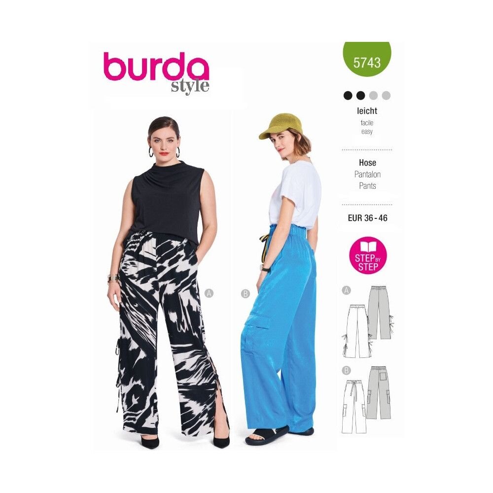 obchod@raj-sitia.skStrih Burda zelený 5743 - nohavice s gumou v páse, saténové nohavice je súbor strihov na ušitie pohodlných letných nohavíc s vysokým pásom. Strihy sú vytlačené na kvalitnom kriedovom papieri. Vďaka jednoduchému strihu, podľa ktorého zvládnu šiť aj začiatočníci, získate originálne modely pre Váš šatník.
