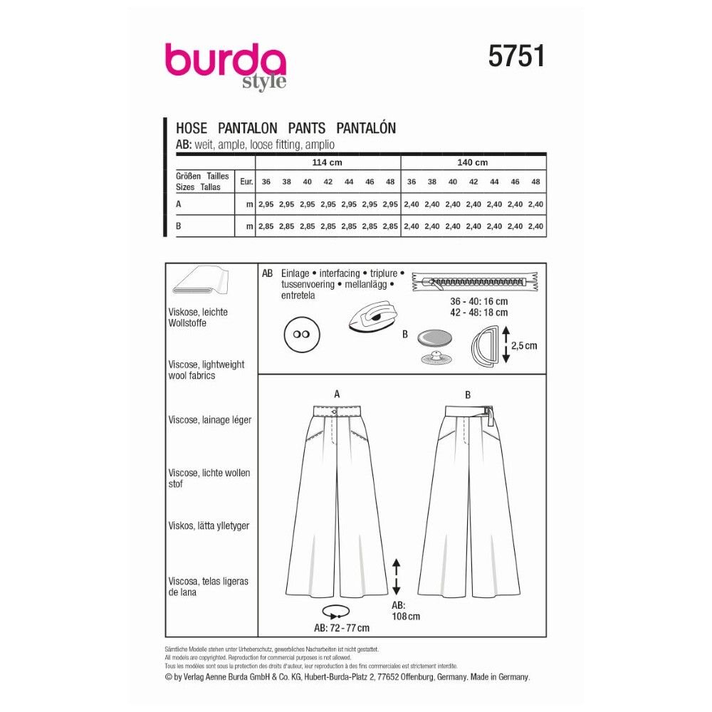 obchod@raj-sitia.skStrih Burda zelený 5751 - nohavice so širokými nohavicami, nohavicová sukňa je súbor strihov na ušitie dámskych nohavíc či sukne. Strihy sú vytlačené na kvalitnom kriedovom papieri. Vďaka jednoduchému strihu, podľa ktorého zvládnu šiť aj začiatočníci, získate originálne modely pre Váš šatník.