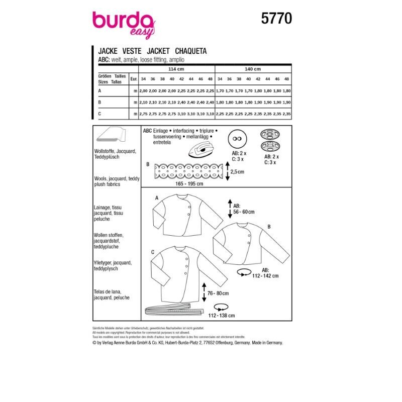 obchod@raj-sitia.skStrih Burda zelený 5770 - dámske sako, plyšový kabátik, krátky kabátik je súbor jednoduchých strihov na ušitie dámskeho saka, plyšového kabátika a krátkeho kabátika. Strihy sú vytlačené na kvalitnom kriedovom papieri. Vďaka jednoduchému strihu, podľa ktorého zvládnu šiť aj začiatočníci, získate originálne modely pre Váš šatník.