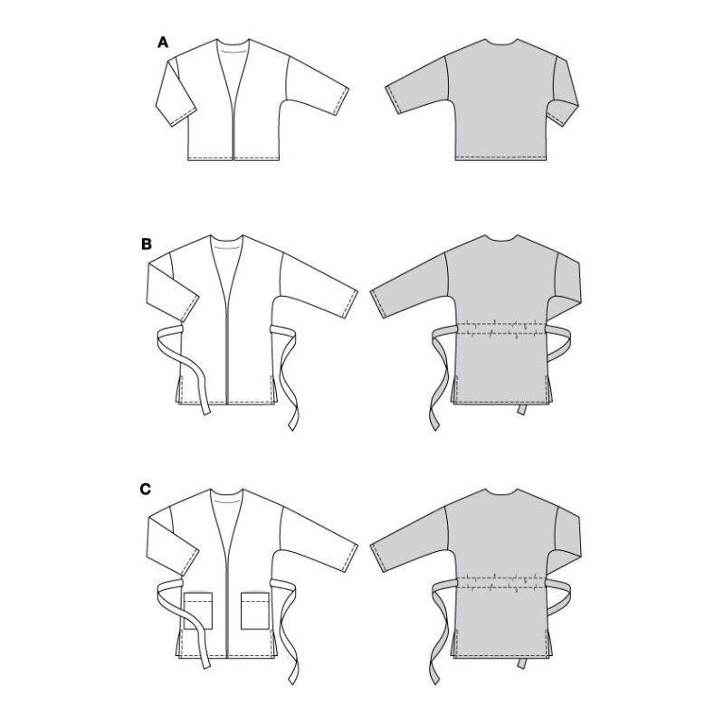 Strih Burda zelený 5787 - otvorené sako, zavinovací kabát s opaskom, vaflový kabát je súbor jednoduchých strihov na ušitie štýlového kabátu a saka.