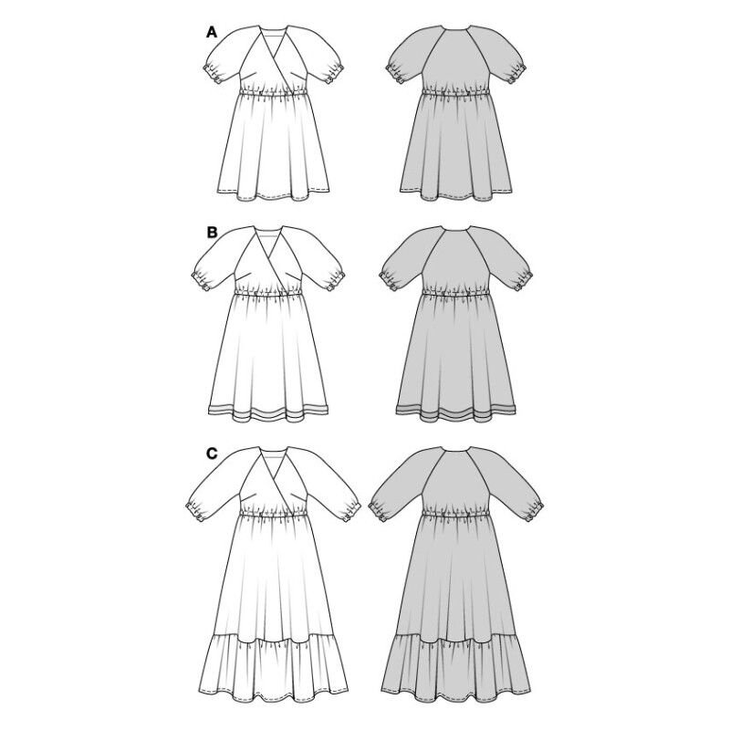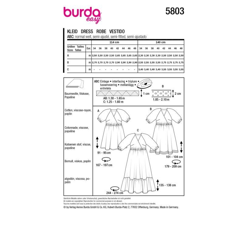 obchod@raj-sitia.skStrih Burda zelený 5803 - dámske zavinovacie šaty, blúzkové šaty je súbor jednoduchých strihov pre ušitie dámskych zavinovacích šiat s gumou v páse a rozšírenou naberanou sukňou, ďalej tiež blúzkových šiat. Strihy sú vytlačené na kvalitnom kriedovom papieri. Vďaka jednoduchému strihu, podľa ktorého zvládnu šiť aj začiatočníci, získate originálne modely pre Váš šatník.