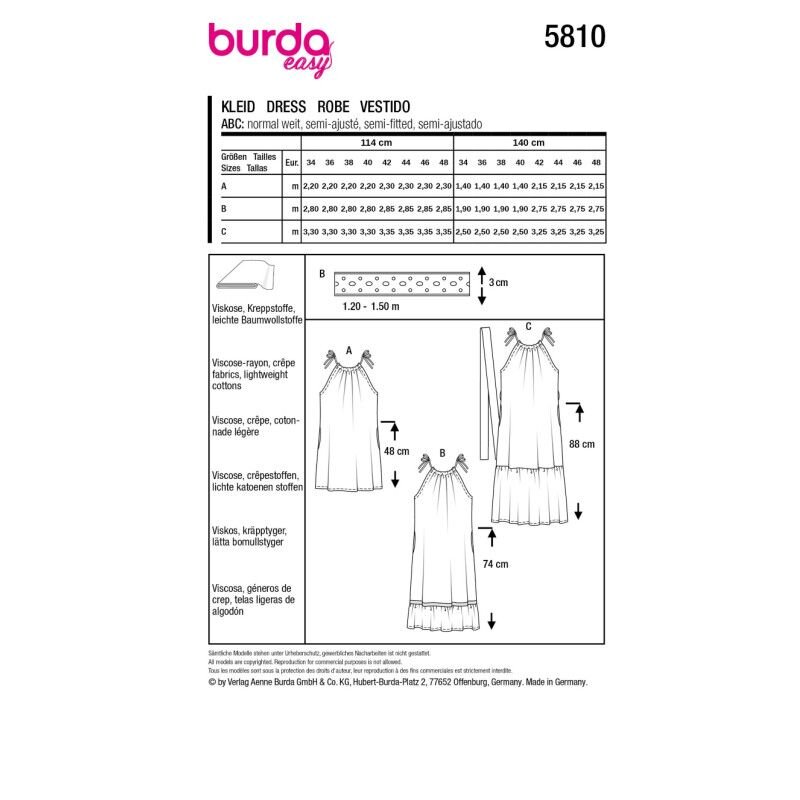 obchod@raj-sitia.skStrih Burda zelený 5810 - šaty so zaväzovacími ramienkami, maxi šaty, mušelínové šaty je súbor strihov na ušitie dámskych šiat. Strihy sú vytlačené na kvalitnom kriedovom papieri. Vďaka jednoduchému strihu, podľa ktorého zvládnu šiť aj začiatočníci, získate originálne modely pre Váš šatník.