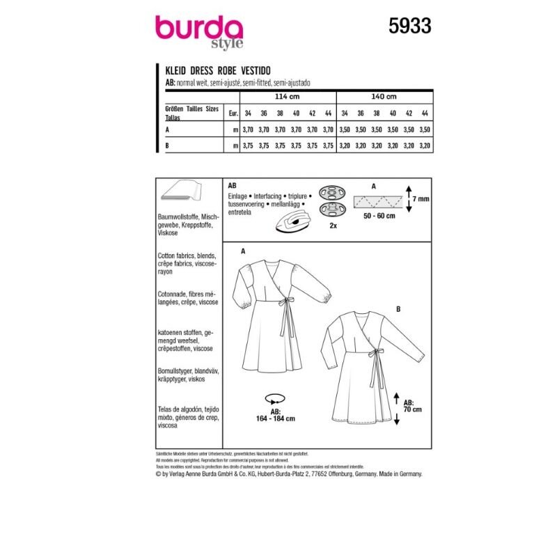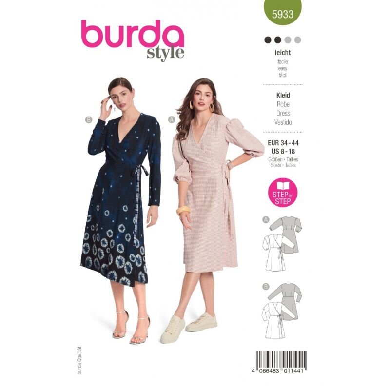 obchod@raj-sitia.skStrih Burda zelený 5933 - zavinovacie šaty je súbor strihov na ušitie dámskych zavinovacích šiat. Strihy sú vytlačené na kvalitnom kriedovom papieri. Vďaka jednoduchému strihu, podľa ktorého zvládnu šiť aj začiatočníci, získate originálne modely pre Váš šatník.