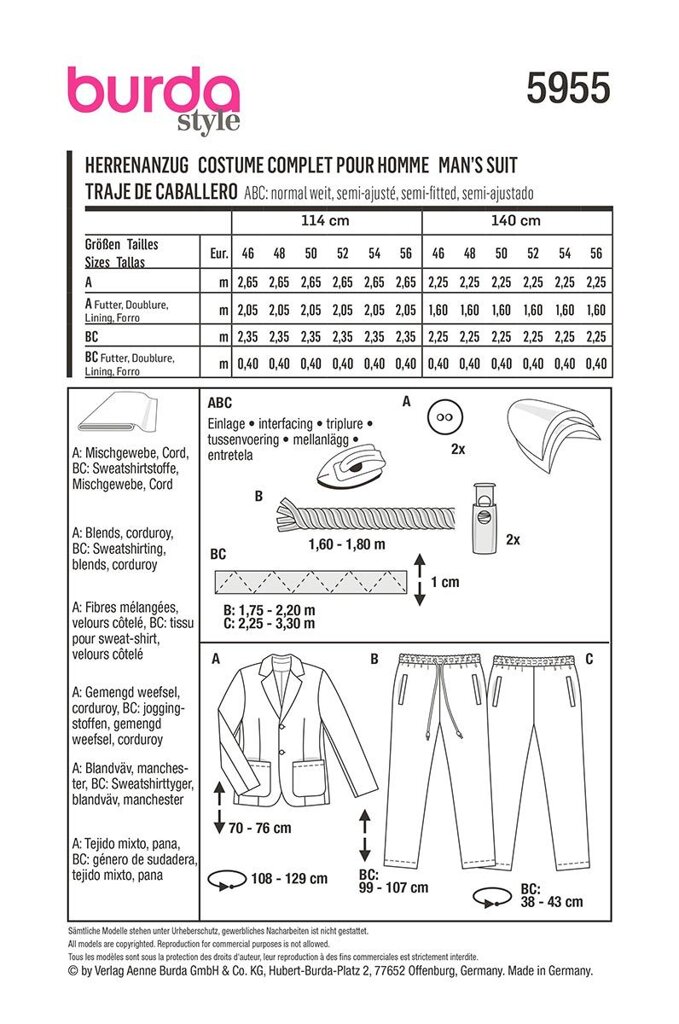 obchod@raj-sitia.skStrih Burda zelený 5955 - pánsky ležérny oblek, sako, teplákové nohavice, je súbor strihov pre ušitie pánskeho obleku, saka, nohavíc Strihy sú natlačené na kvalitnom kriedovom papieri Súbor obsahuje strih modely pre pánsky šatník.