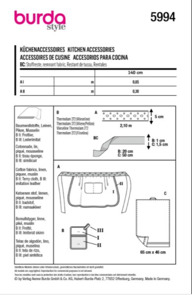 obchod@raj-sitia.skStrih Burda zelený 5994 - zástera, chňapka, utierka je súbor strihov na ušitie zástery, chňapky a utierky. Strihy sú vytlačené na kvalitnom kriedovom papieri. Súbor obsahuje strihy na ušitie kuchynských doplnkov v podobe zástery, chňapky a utierky. Vďaka jednoduchému strihu, podľa ktorého zvládnu šiť aj začiatočníci, získate originálne doplnky do Vašej kuchyne.