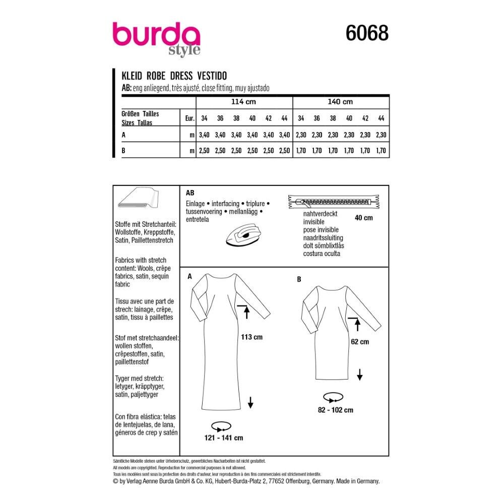 obchod@raj-sitia.skStrih Burda zelený 6068 - puzdrové šaty s výstrihom na chrbte, plesové šaty je súbor jednoduchých strihov na ušitie krásnych plesových či spoločenských šiat. Strihy sú vytlačené na kvalitnom kriedovom papieri. Vďaka jednoduchému strihu, podľa ktorého zvládnu šiť aj začiatočníci, získate originálne modely na ples a iné spoločenské akcie.