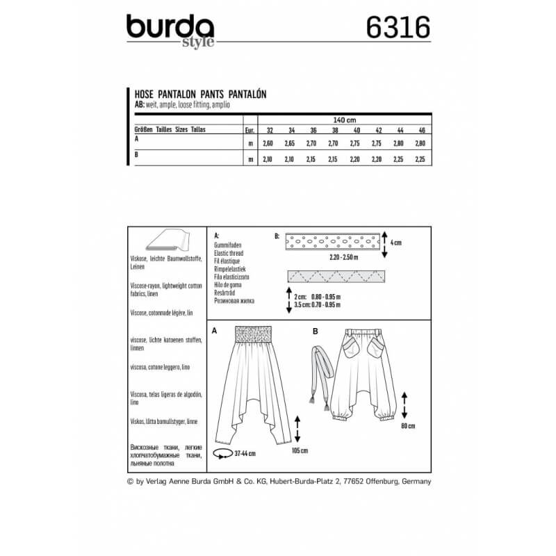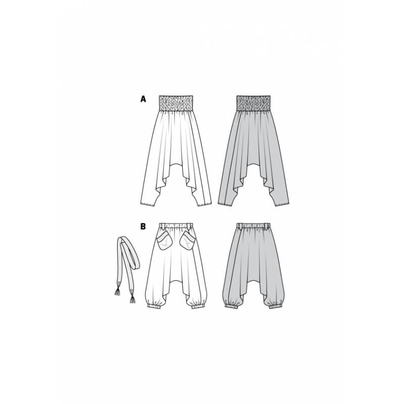 Strih Burda zelený 6316 - dámske háremové nohavice, turecké nohavice je súbor jednoduchých strihov na ušitie dámskych háremových a tureckých nohavíc