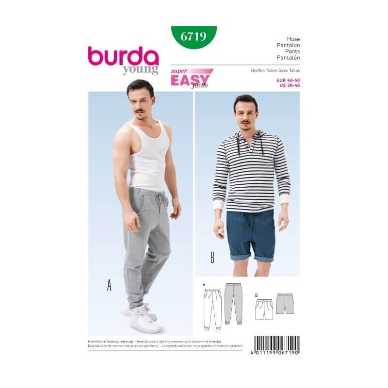obchod@raj-sitia.skStrih Burda zelený číslo 6719 - pánske nohavice - tepláky, je súbor strihov na ušitie pánskych nohavíc - teplákov a kraťasov. Strihy sú vytlačené na kvalitnom kriedovom papieri. Súbor obsahuje strihy na ušitie pánskych nohavíc, teplákov a kraťasov. Vďaka jednoduchému strihu, podľa ktorého zvládnu šiť aj začiatočníci, získate originálne modely pre pánsky šatník.