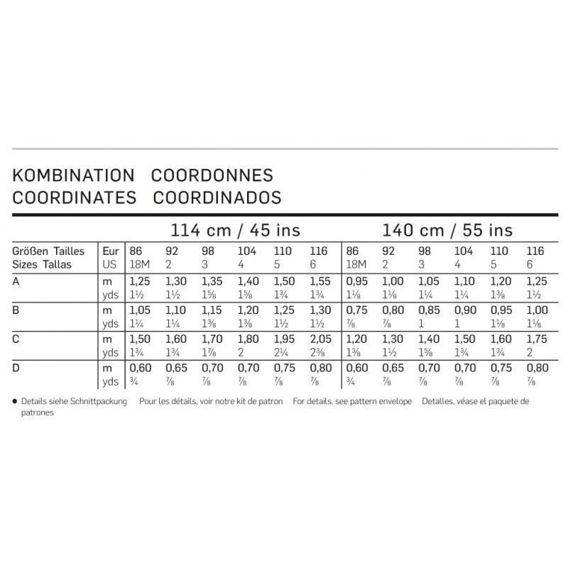 Strihy sú s prídavkami na švy vo veľkosti 86 - 116. Ak chcete strihy ďalej používať, odporúča sa ich prekresliť na hodvábny papier. Líniu strihu ďalej ľahko prenesiete na látku pomocou kopírovacieho papiera a kopírovacieho radla. Potrebné pomôcky nájdete aj v našom obchode.