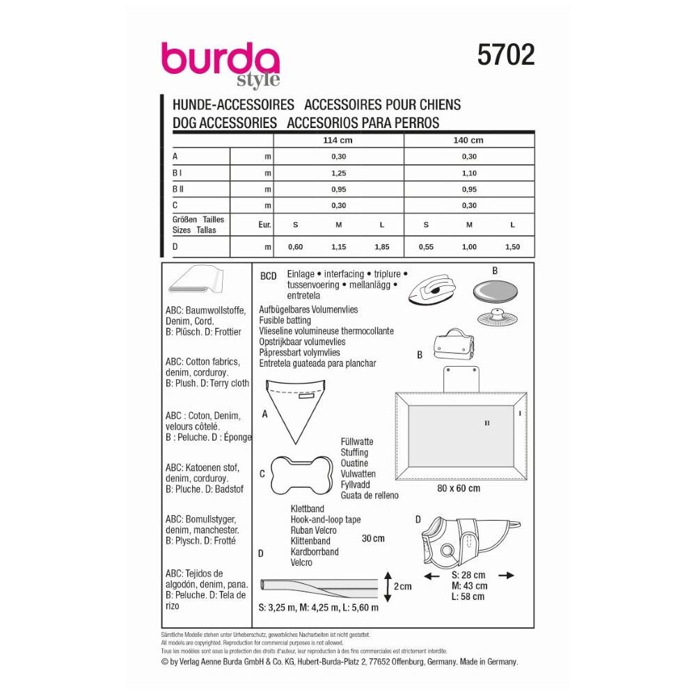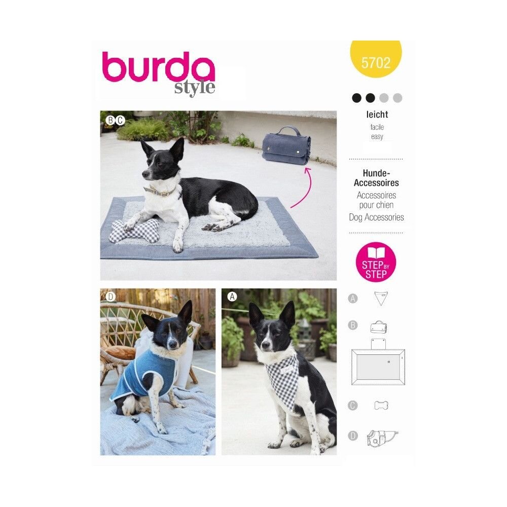 obchod@raj-sitia.skStrih Burda žltý 5702 - šatka a kabátik pre psa, cestovný pelech, hračka je súbor strihov na doplnkov pre psov. Strihy sú vytlačené na kvalitnom kriedovom papieri. Vďaka jednoduchému strihu, podľa ktorého zvládnu šiť aj začiatočníci, získate originálne modely.