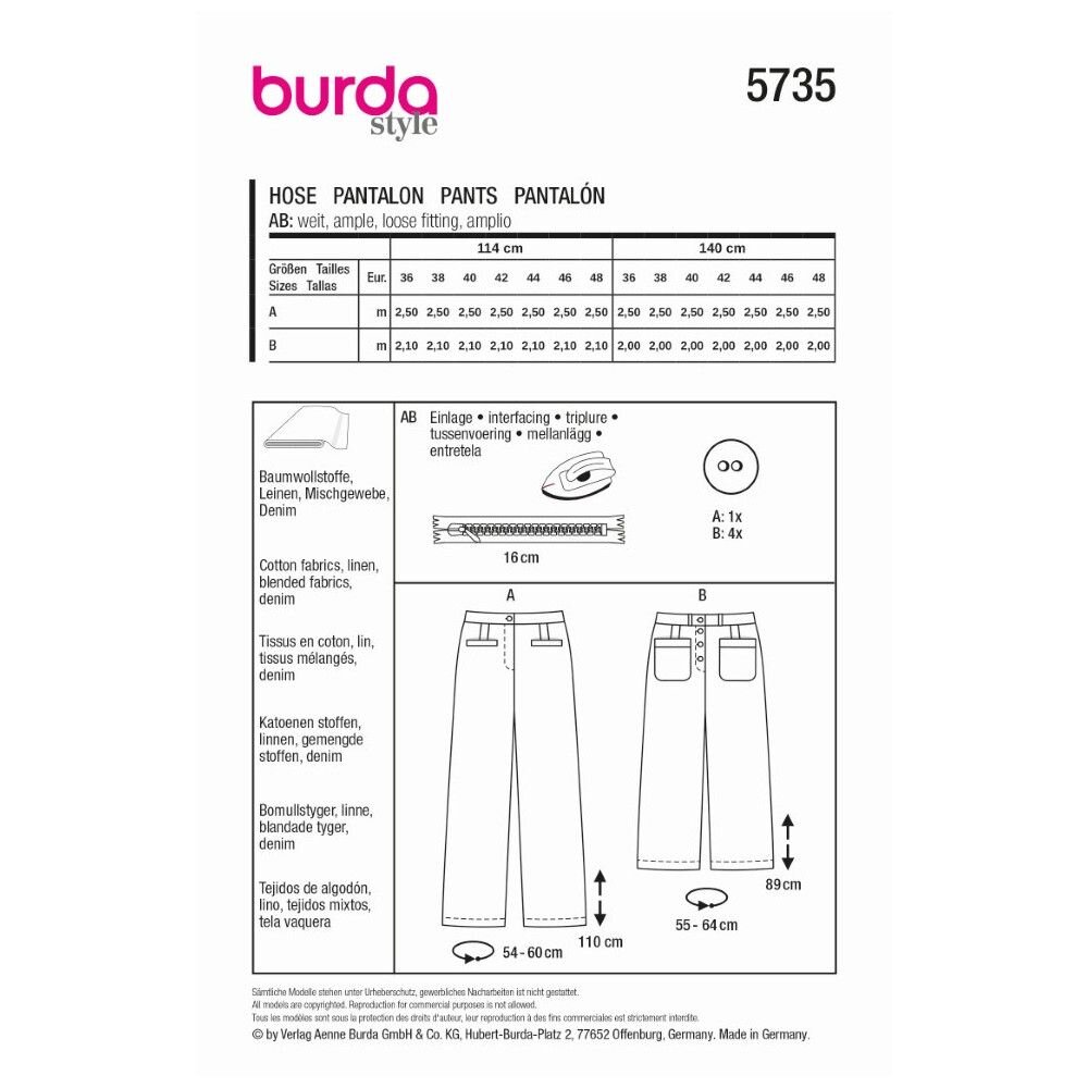 obchod@raj-sitia.skStrih Burda žltý 5735 - nohavice s rovnými nohavicami, ľanové a riflové nohavice, mom jeans je súbor strihov na ušitie pohodlných nohavíc. Strihy sú vytlačené na kvalitnom kriedovom papieri. Vďaka jednoduchému strihu, podľa ktorého zvládnu šiť aj začiatočníci, získate originálne modely pre Váš šatník.