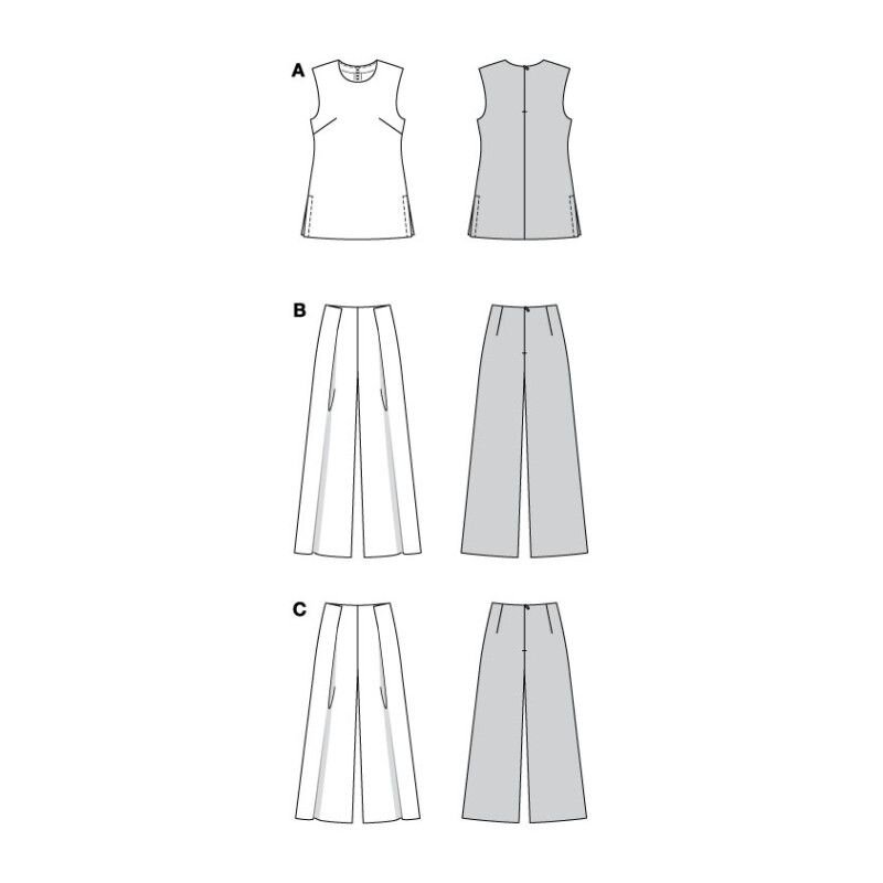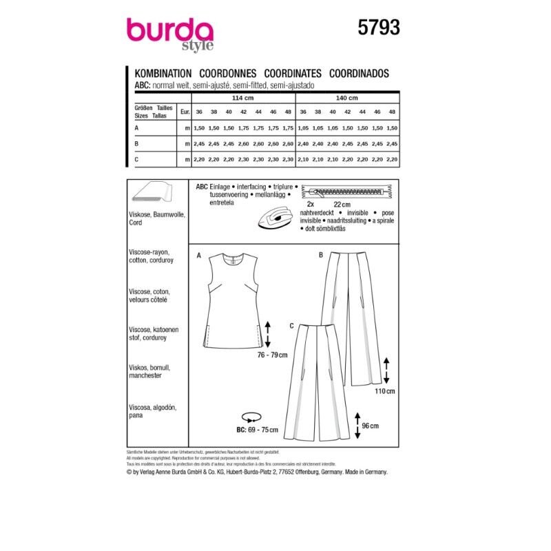 obchod@raj-sitia.skStrih Burda žltý 5793 - top bez rukávov, tunika, voľné nohavice so skladmi je súbor jednoduchých strihov pre ušitie dámskeho topy bez rukávov s bočnými rázporkami a tiež nohavíc so širokými nohavicami. Strihy sú vytlačené na kvalitnom kriedovom papieri. Vďaka jednoduchému strihu, podľa ktorého zvládnu šiť aj začiatočníci, získate originálne modely pre Váš šatník.