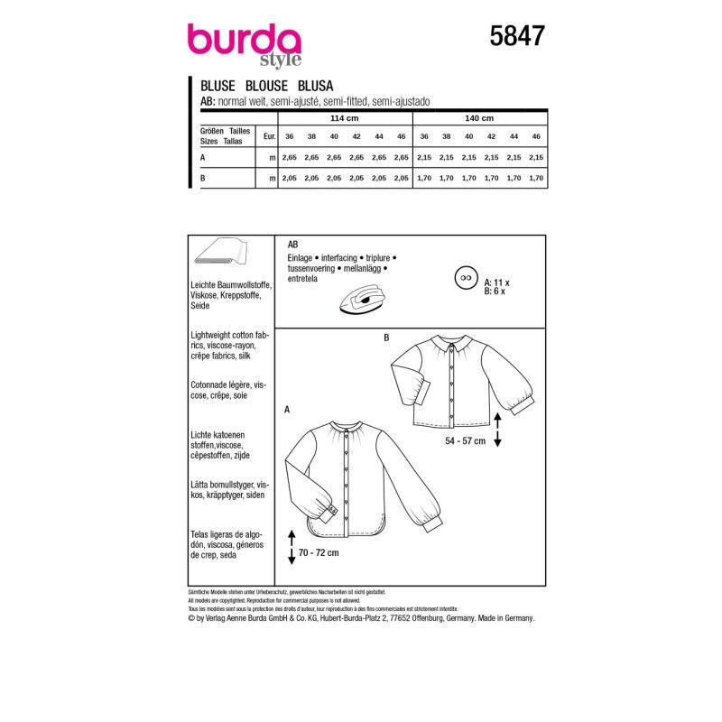 obchod@raj-sitia.skStrih Burda žltý 5847 - dámska blúzka, košeľa je súbor strihov pre ušitie dámskej blúzky a košele. Strihy sú vytlačené na kvalitnom kriedovom papieri. Súbor obsahuje strihy na ušitie dámskeho oblečenia. Rozšírte si šatník originálnymi kúskami.