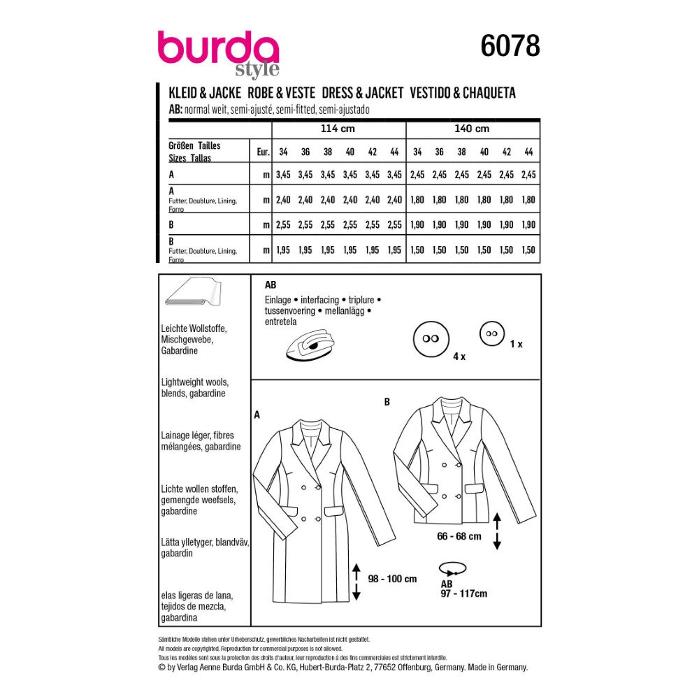 obchod@raj-sitia.skStrih Burda žltý 6078 - sakové šaty, dlhé sako, dvojradové sako je súbor strihov na ušitie dámskeho saka na 3 spôsoby. Strihy sú vytlačené na kvalitnom kriedovom papieri. Vďaka jednoduchému strihu, podľa ktorého zvládnu šiť aj začiatočníci, získate originálne modely pre pánsky šatník.