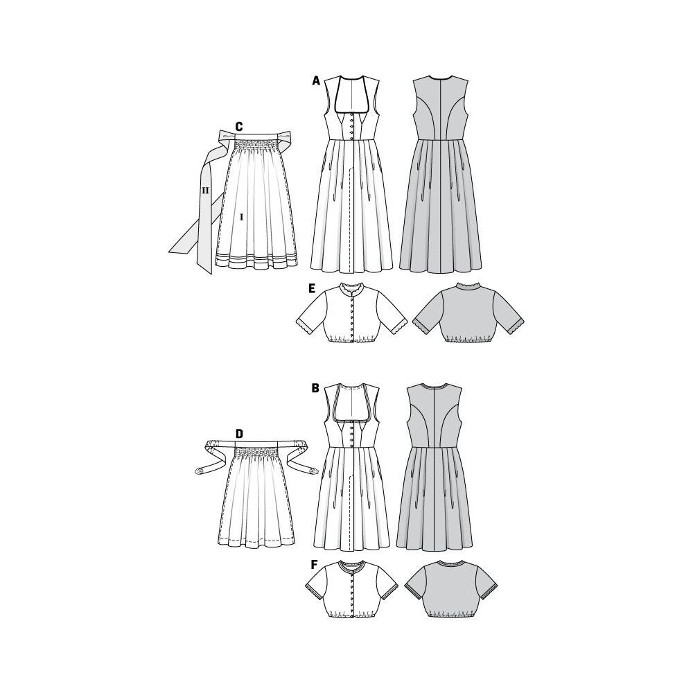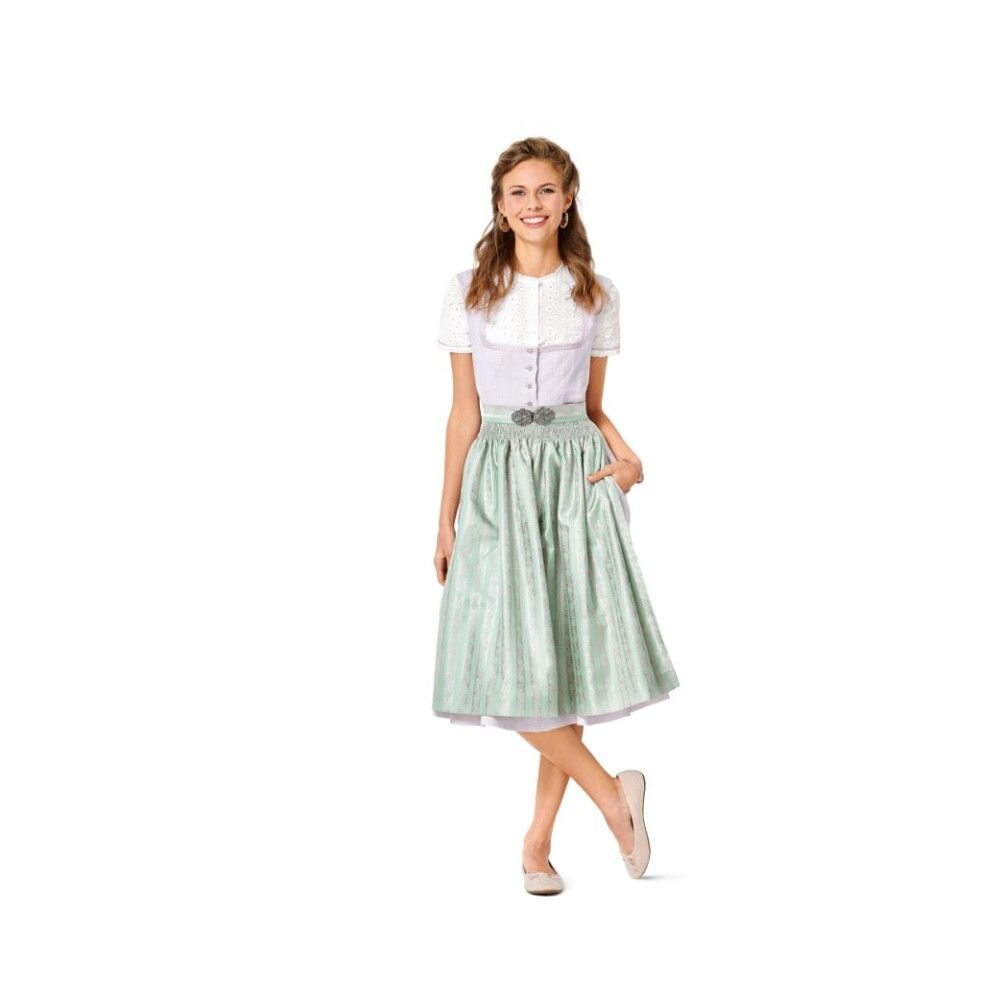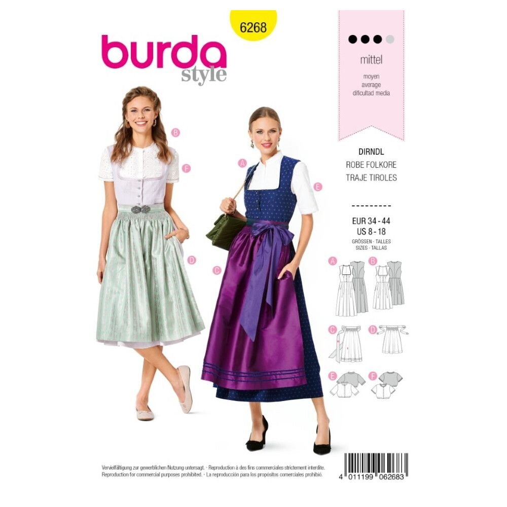 Strih Burda žltý 6268 - krojové šaty, zástera, blúzka je súbor jednoduchých strihov na ušitie krojových šiat, krojové zástery a krojové blúzky.