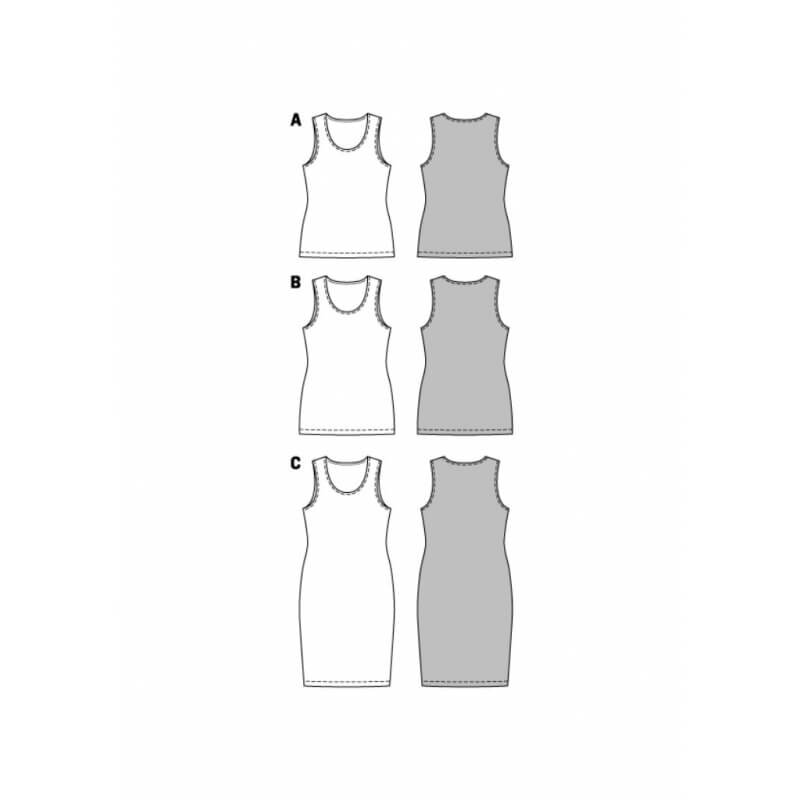 Strih Burda žltý 6672 - dámske tielko, tielkové šaty pre plnoštíhle je súbor jednoduchých strihov pre ušitie tielka/tielkových šiat pre plnoštíhle
