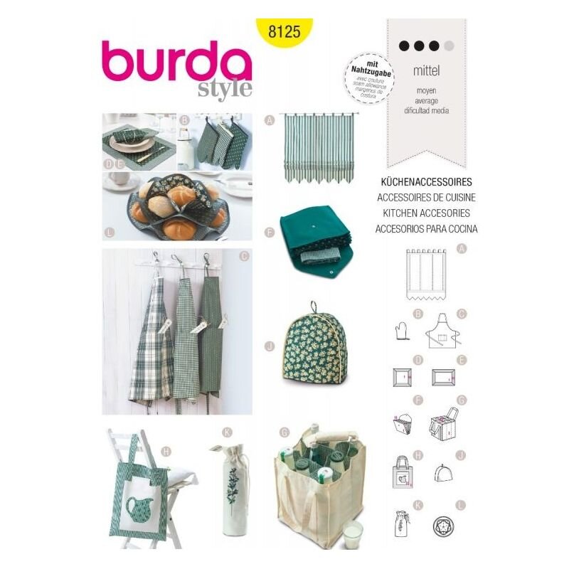 obchod@raj-sitia.skStrih Burda žltý 8125 - kuchynské doplnky je súbor strihov na ušitie kuchynských doplnkov, zástery, chňapky, prestieranie, záves. Strihy sú vytlačené na kvalitnom kriedovom papieri. Súbor obsahuje strihy na ušitie doplnkov do Vašej kuchyne.