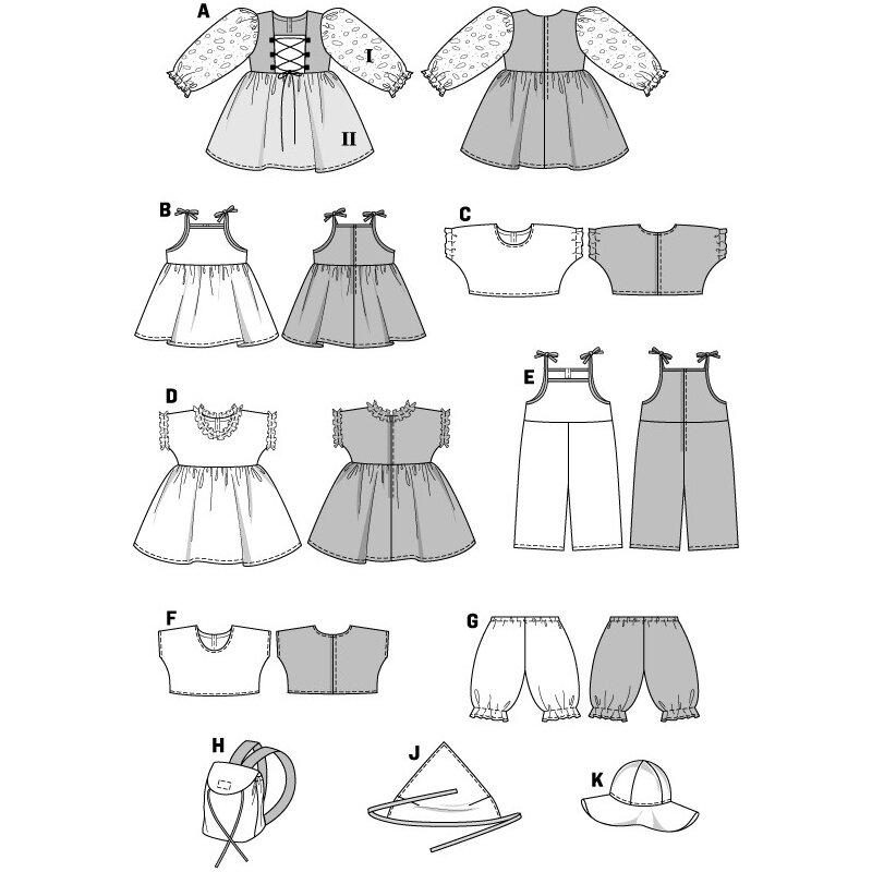 Strih Burda žltý 8308 - oblečky pre bábiky je súbor jednoduchých strihov na ušitie oblečkov pre bábiky.