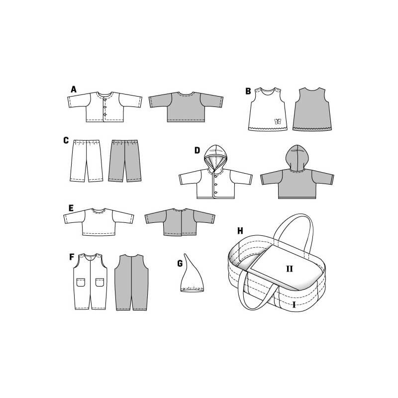obchod@raj-sitia.skStrih Burda žltý 8591 - oblečenie pre bábiky a taška je súbor strihov na oblečky pre bábiky a tašku. Strihy sú vytlačené na kvalitnom kriedovom papieri. Súbor obsahuje 8 modelov. Nájdete tu strihy na šatovú sukienku, šatôčky, kabátiky s kapucňou aj bez, laclové nohavičky, nohavice do pása, čiapočku a tašku na prenášanie bábiky, dá sa použiť aj ako cestovná postieľka. Jednotlivé modely tak môžete medzi sebou kombinovať. Nájdete tu strihy pre dve veľkosti bábik.