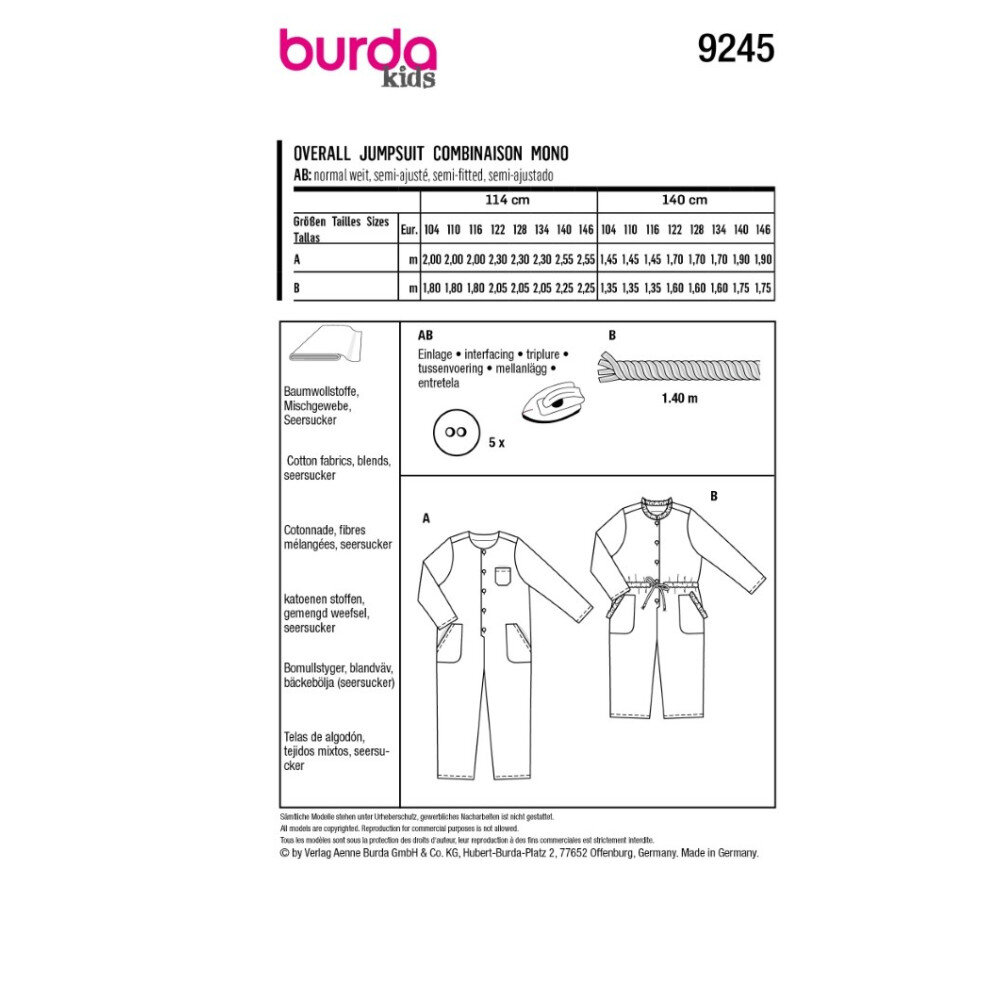 obchod@raj-sitia.skStrih Burda žltý 9245 - overal pre dievčatá a chlapcov je súbor strihov na ušitie overalu pre väčšie deti. Strihy sú vytlačené na kvalitnom kriedovom papieri. Vďaka jednoduchému strihu, podľa ktorého zvládnu šiť aj začiatočníci, získate originálne modely pre pánsky šatník.