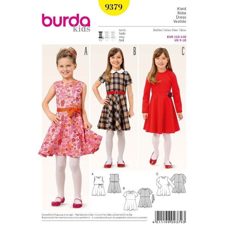 Strih Burda žltý 9379 - detské šaty s kolesovou sukňou je súbor elegantných a jednoduchých strihov na dievčenské šaty s kolesovou sukňou.