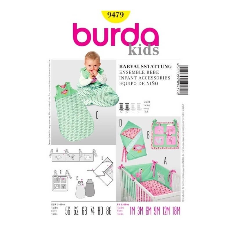 obchod@raj-sitia.skStrih Burda žltý číslo 9479 - výbava do postieľky pre bábätko, je súbor strihov pre ušitie základnej výbavy do postieľky pre bábätko. rýchlozavinovačku, praktický vreckár a vrece na spanie.