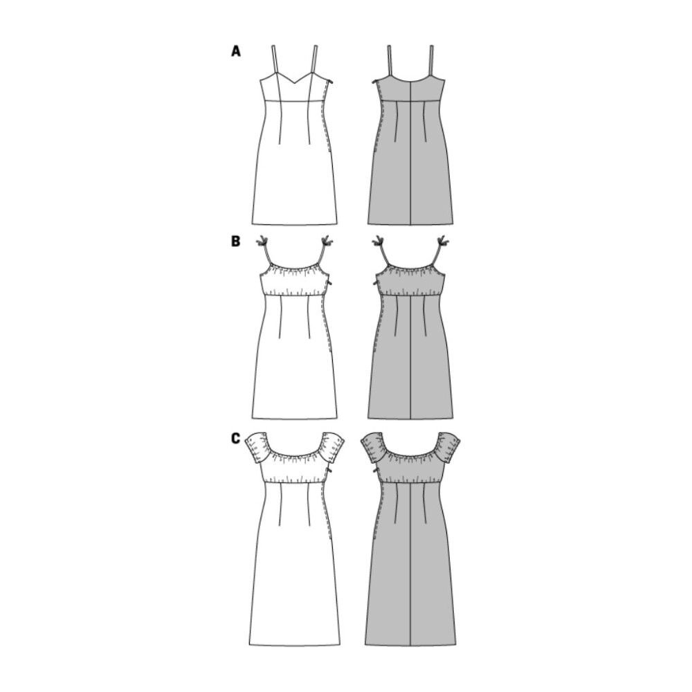 Střih Burda žlutý 6686 - áčkové šaty na ramínka, šaty carmen, empírové šaty je soubor jednoduchých střihů na ušití dámského letních šatů.