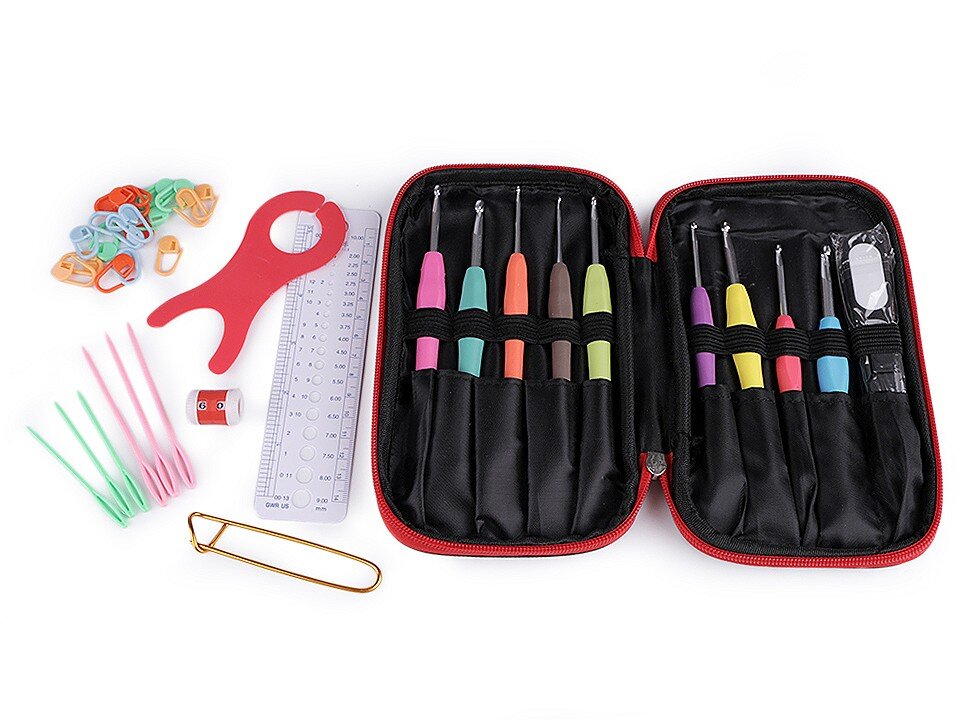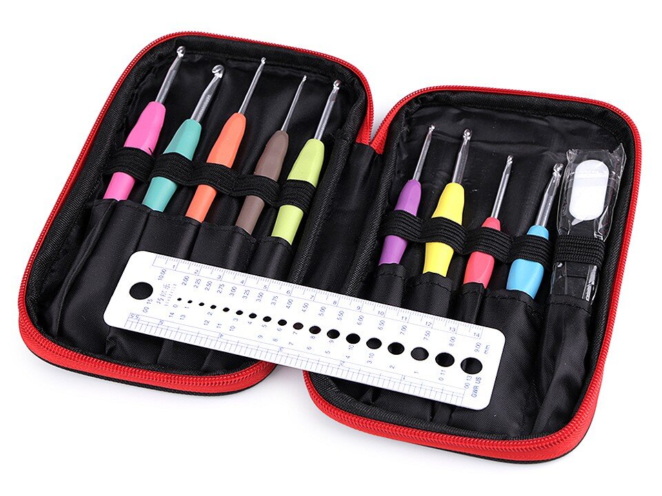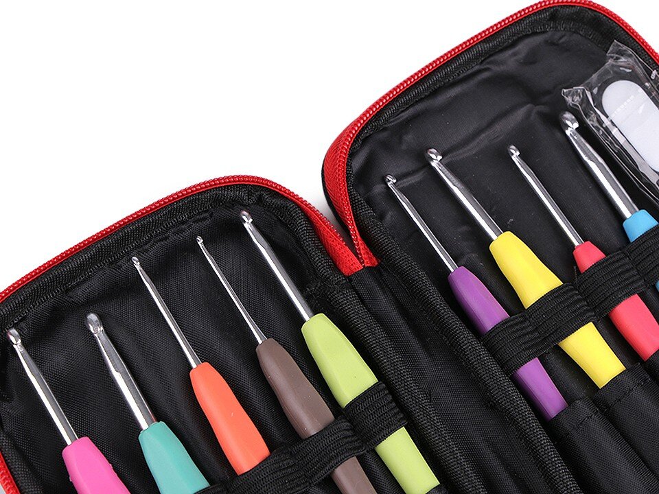 Sada háčikov so silikónovou rukoväťou a pomôcok na háčkovanie v puzdre. Silikónová rukoväť je ideálna pre pohodlné držanie v ruke. Háčik je v sade v rôznych veľkostiach spolu s príslušenstvom na háčkovanie.