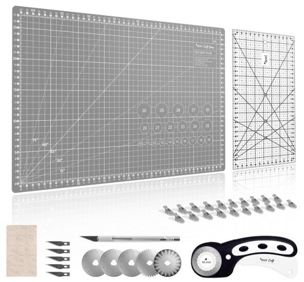 obchod@raj-sitia.skSúprava na patchwork a šitie Texi Craft sivá 45x30 je zostava v ktorej nájdete všetko čo by ste mohli potrebovať pre patchwork. Sada na rezanie je veľká 45 x 30 cm as prehľadom s ňou uskutočníte malé aj stredné projekty. Táto sada umožňuje presnejšie meranie a uľahčuje následné rezanie.