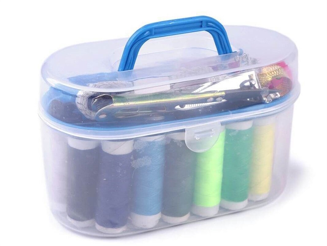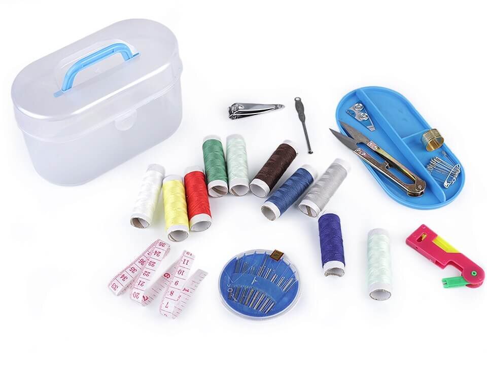 Súprava na šitie uložená v praktickom plastovom boxe modrej farby. Táto sada obsahuje bohaté vybavenie. Jednoducho v nej nájdete všetko potrebné na ručné šitie aj rýchlu úpravu odevov.