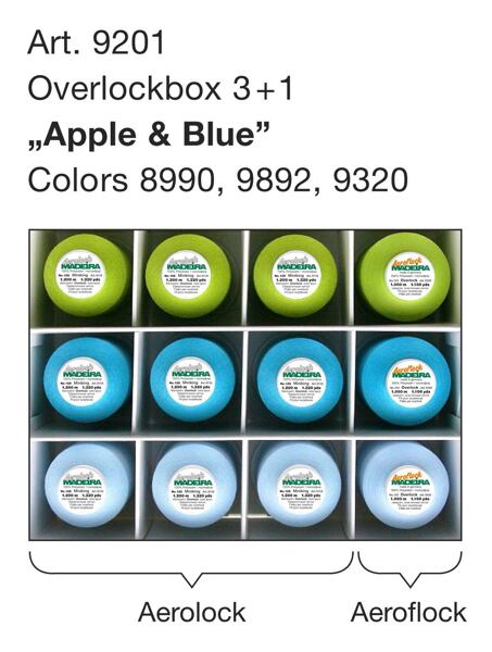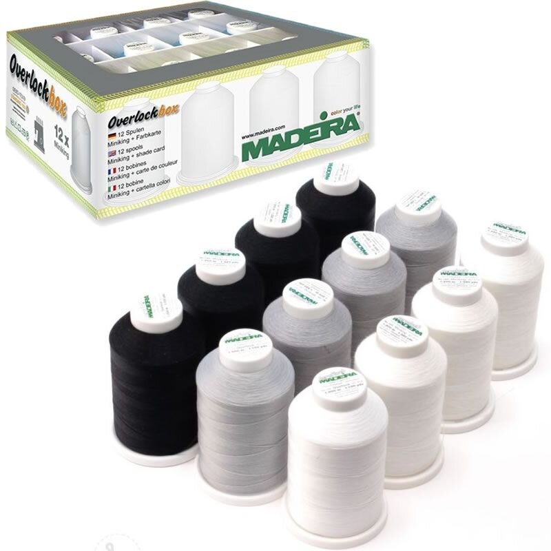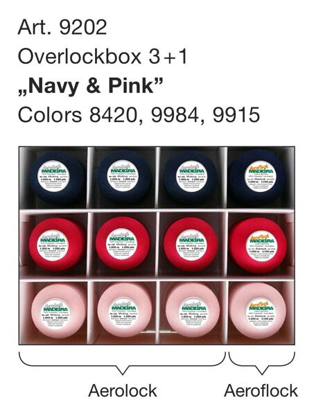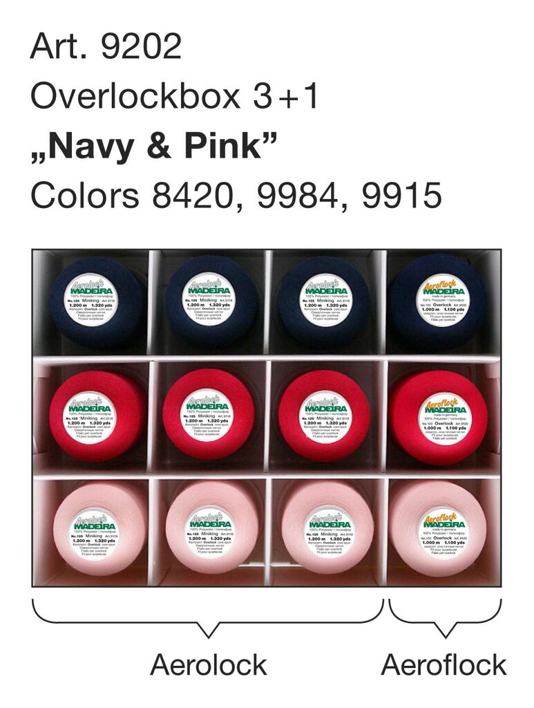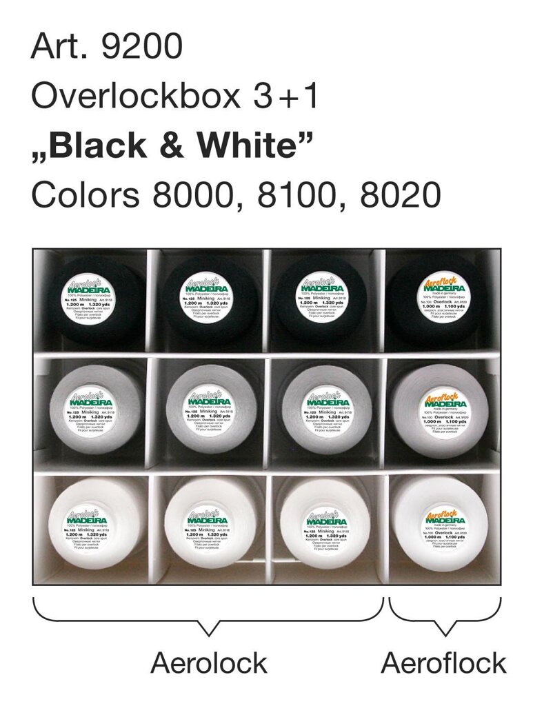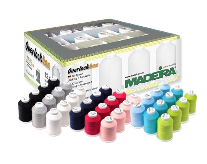 Sada nití Overlock Aerolock a Aeroflock na docielenie dokonalých stehov. Kombinácia dvoch druhov nití v praktickom boxe s farebne zladenými špulkami.