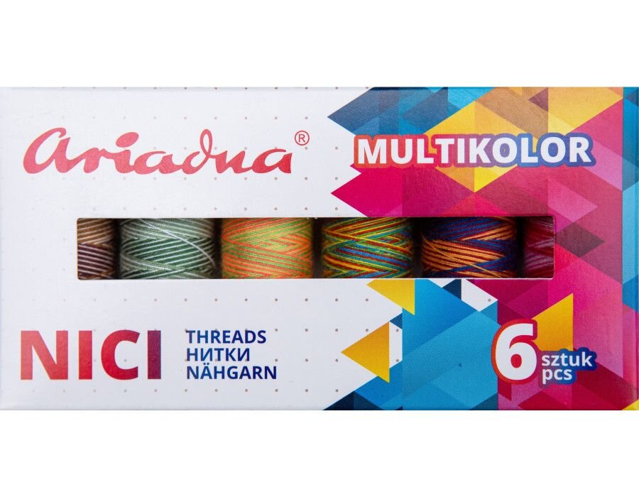 Sada šijacích nití Ariadna Talia vo vyhotovení multicolor - zemitej farby, ktorá obsahuje 6 špulík po 150 metroch. Jedná sa o kvalitné nite európskeho výrobcu nití Ariadna. Šijacie univerzálne nite pre domáce i priemyselné šijacie stroje, s ktorými môžete šiť prakticky čokoľvek od blúzok, košieľ, nohavíc až po tenkú bundu alebo sako. Nite môžeme odporučiť aj pre patchwork aj detské odevy. Nite majú certifikát.