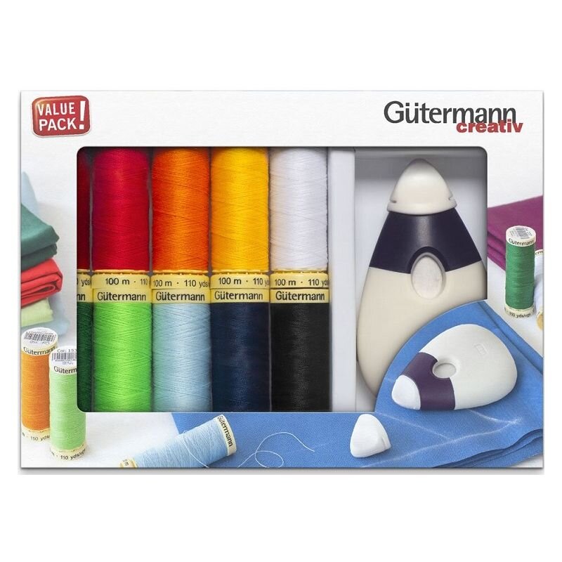 Sada šijacích nití PES Gütermann (10 x 100 m) + kriedové riadielko, je sada, ktorá nájde využitie v každej domácnosti a je skvelá aj ako darček.