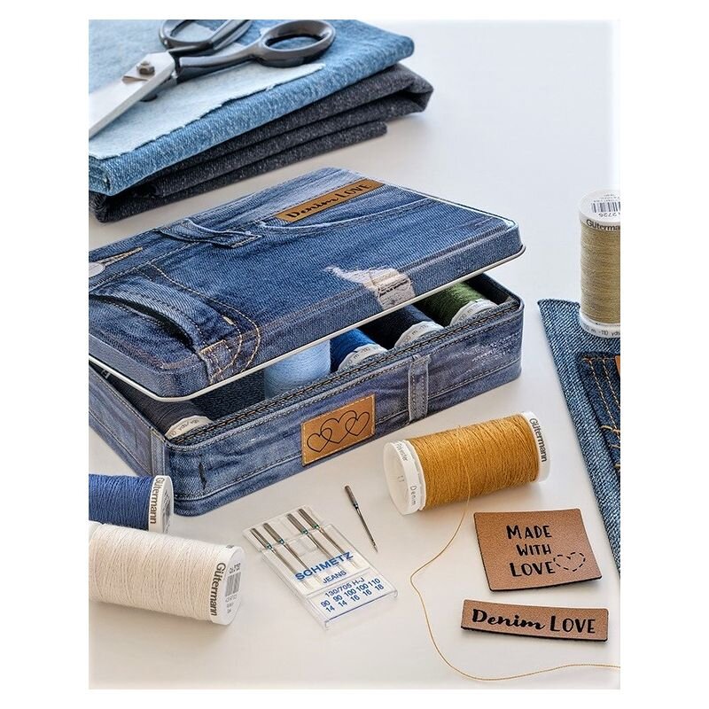 Súprava šijacích nití PES Gütermann DENIM (12x100m) v plechovej krabičke spolu so sadou ihiel a štýlovými nášivkami.