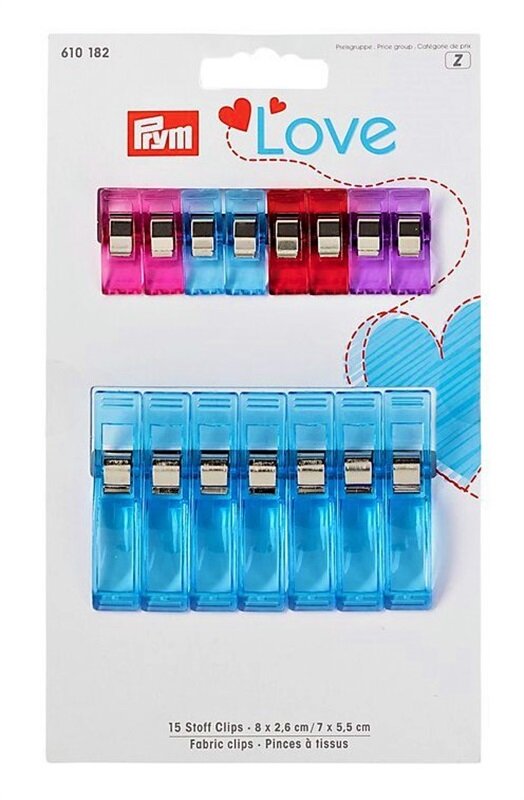 Svorky na textil mix 15 ks PRYM Love sú používané na spojenie látky namiesto špendlíkov. Používajú sa pri látkach, kde by boli prepisy špendlíkov viditeľné, výborná pomôcka pri šití patchworku a pružných materiálov.
