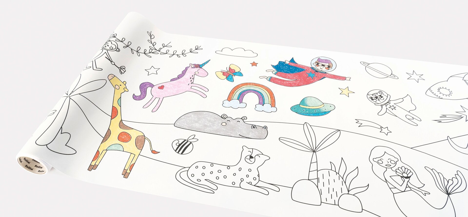 Samolepiaca rolka papiera s predtlačenými obrázkami pre vymaľovanie pre deti. Veselé a dobrodružné obrázky, ktorými si deti môžu niečo ozdobiť.