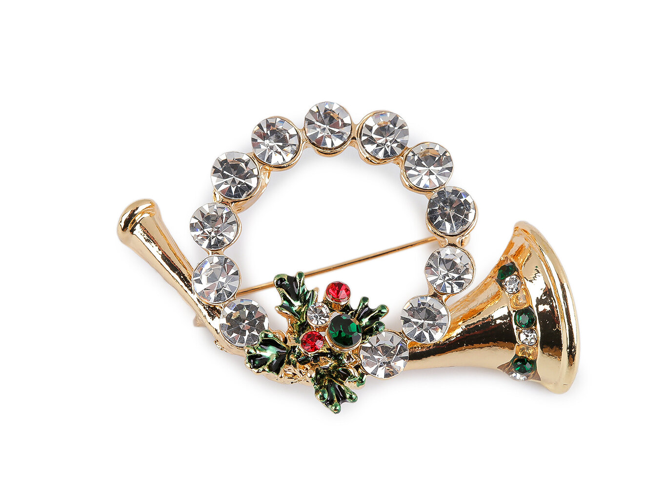 Elegantná brošňa venček s rúrkou skvele ozdobí Váš outfit na Vianoce. Zlatá brošňa s brúsenými kamienkami.