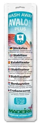 Vlizelín - Avalon PLUS - Madeira (30cm x 3m) je profesionálny podklad pre vyšívanie. Jedná sa o vodú rozpustnú netkanú textíliu, vlizelín slúži na stabilizáciu výšiviek u chúlostivých materiálov.
