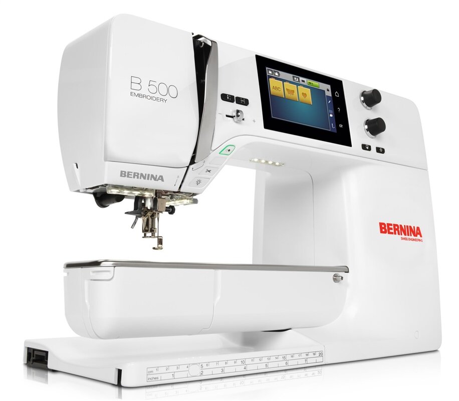 Dôležité vlastnosti: Vyšívací stroj Bernina B 500 ponúka maximálnu vyšívaciu plochu 400 x 150 mm, rýchlosť vyšívania 1000 st./min. a 275 uložených vyšívacích vzorov. Vyšívací stroj Bernina 500 je vybavený 10 cm veľkým farebným dotykovým displejom, na ktorom jednoducho môžete vzory upravovať, tlačidlom START/STOP, plynulou reguláciou rýchlosti, indikátormi hornej a spodnej nite a navíjanie spodnej nite pri vyšívaní. Tento stroj má USB port, cez ktorý je možné do stroja prenášať nové vyšívacie vzory vo formátoch: .EXP, .DST, .PES, .PEC, .JEF, .SEW, .PCS, .XXX. Stroj má funkcie ako bodové umiestnenie, späť/znovu, zoskupiť/rozoskupiť, kruh farieb, neviditeľné zapošitie, múdre zapošitie, príkaz "vytiahnuť niť", programovateľný odstrih preskakovacích stehov, režim zatiahnutia nite "Thread Away" a je kompatibilný so softvérom Bernina DesignWorks Tools.