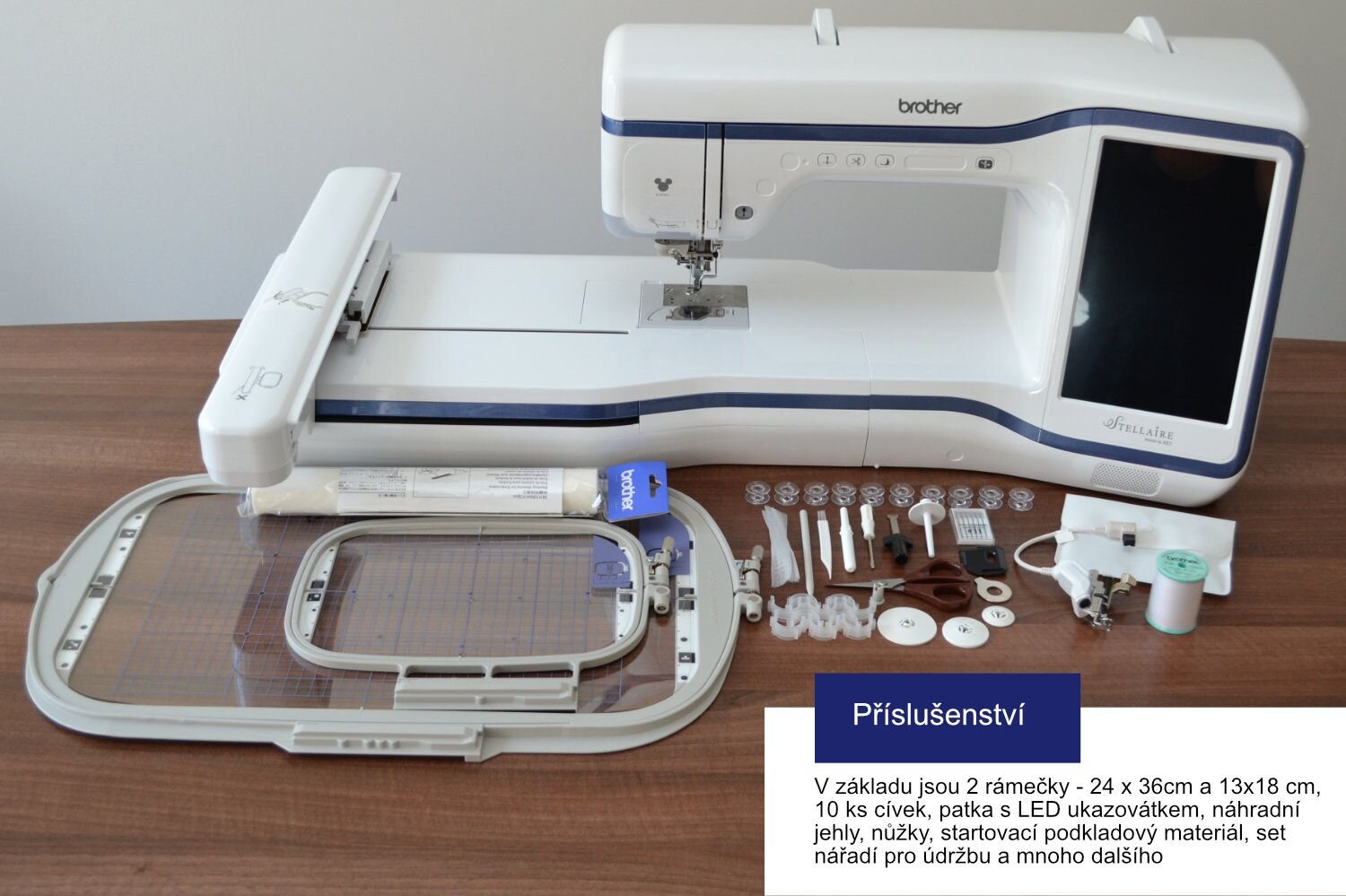 obchod@raj-sitia.skVyšívací stroj Brother Innov-is Stellaire XE1 je novinkou, která přišla na podzim roku 2019. Tento špičkový model vyšívacího stroje umožňuje kreativní tvorbu každému uživateli. Tento stroj má vyšívací plochu 240 x 360 mm, přednastavených 727 vzorů společně s 22 vyšívacími abecedami, které Vám snadno díky rychlosti 1050 st./min. vyšije s precizností, kterou vyšívací stroje Brother značí. Barevný dotykový displej o velikosti 10,1", díky kterému stroj snadno obsloužíte, nastavíte atd. Brother Stellaire XE1 má nově precizní systém pro pozicování výšivek pomocí aplikace, kterou si stáhnete do mobilního telefonu, v ní rámečky vyfotíte a přenesete do stroje! S tímto strojem se kreativitě meze nekladou!