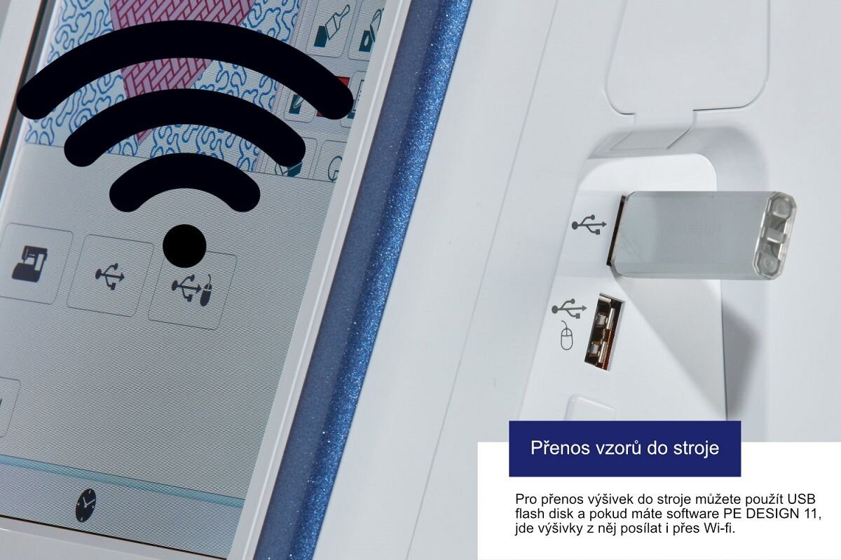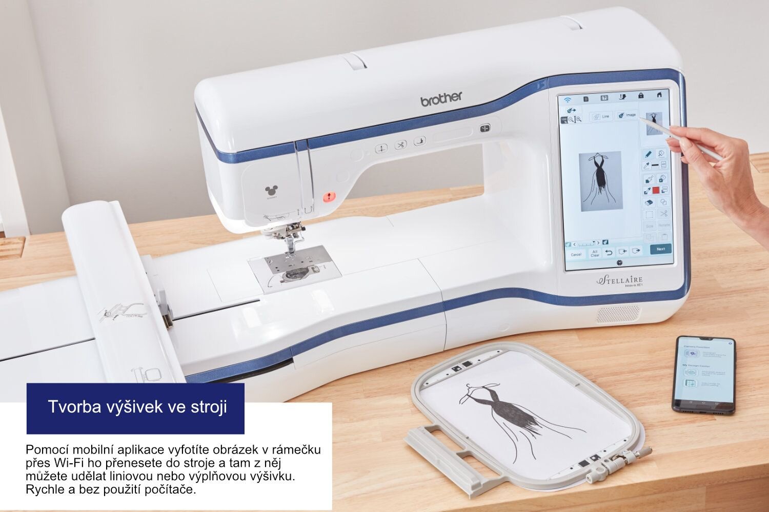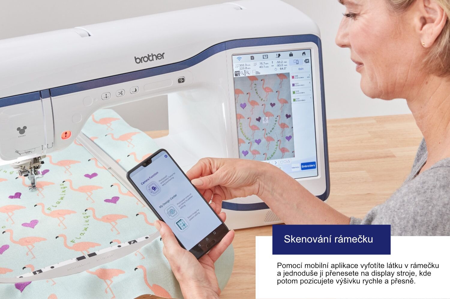 Mobilní aplikace My Design Snap - ke stroji jsou dodávány jedinečné rámečky se skenovacími značkami, které ve spojení s mobilní aplikací Brother My Design Snap App (Android 5 a vyšší i iOS) umožňuje vyfotit mobilem rámeček i s upnutou látkou, obraz přenést na obrazovku stroje a potom pozicovat výšivky na chlup přesně. Pokud potřebujete přesně umístit výšivku nad kaspu nebo spojit dvě velké výšivky, s touto aplikací je to snadné.