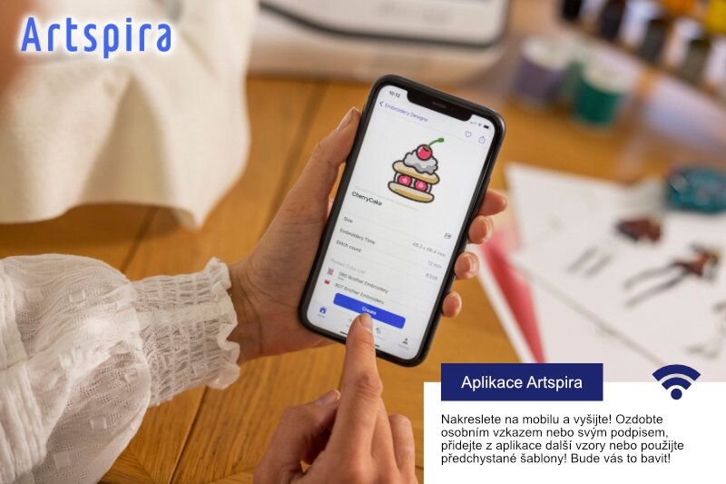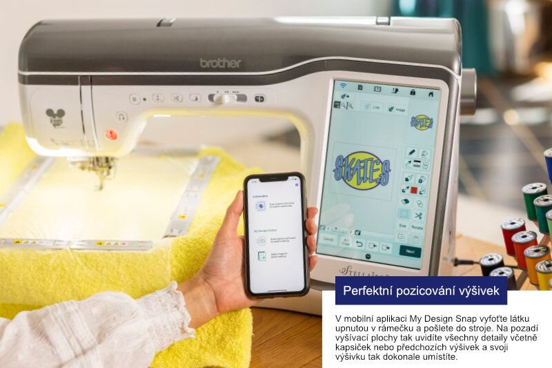 Mobilné aplikácie My Design Snap - ku stroju sú dodávané jedinečné rámčeky so skenovacími značkami, ktoré v spojení s mobilnou aplikáciou Brother My Design Snap App (Android 5 a vyššie aj iOS) umožňuje odfotiť mobilom rámček aj s upnutou látkou, obraz preniesť na obrazovku stroja a potom pozíciovať výšivky na chlp presne. Pokiaľ potrebujete presne umiestniť výšivku nad vrecko alebo spojiť dve veľké výšivky, s touto aplikáciou je to ľahké.