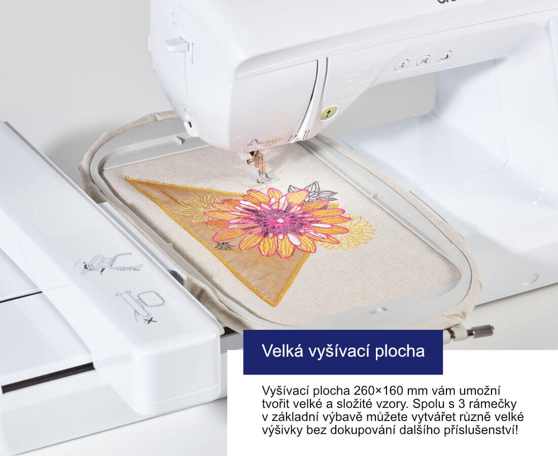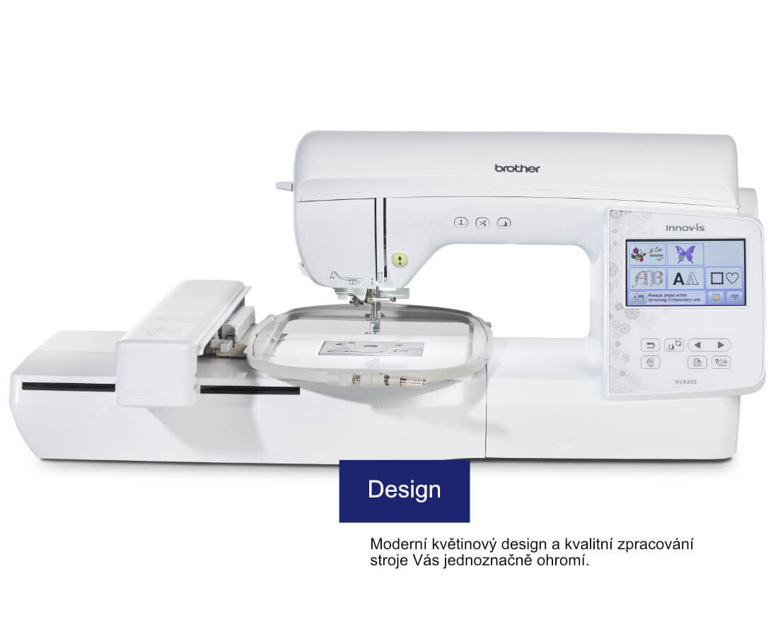 Vyšívací stroj Brother NV 880 E je vylepšenou verziou obľúbenej NV 870 SE, je vybavený farebným dotykovým displejom a vyšívacou plochou až 260 x 160 cm. V pamäti stroja nájdete 258 vyšívacích vzorov a 13 typov písma.