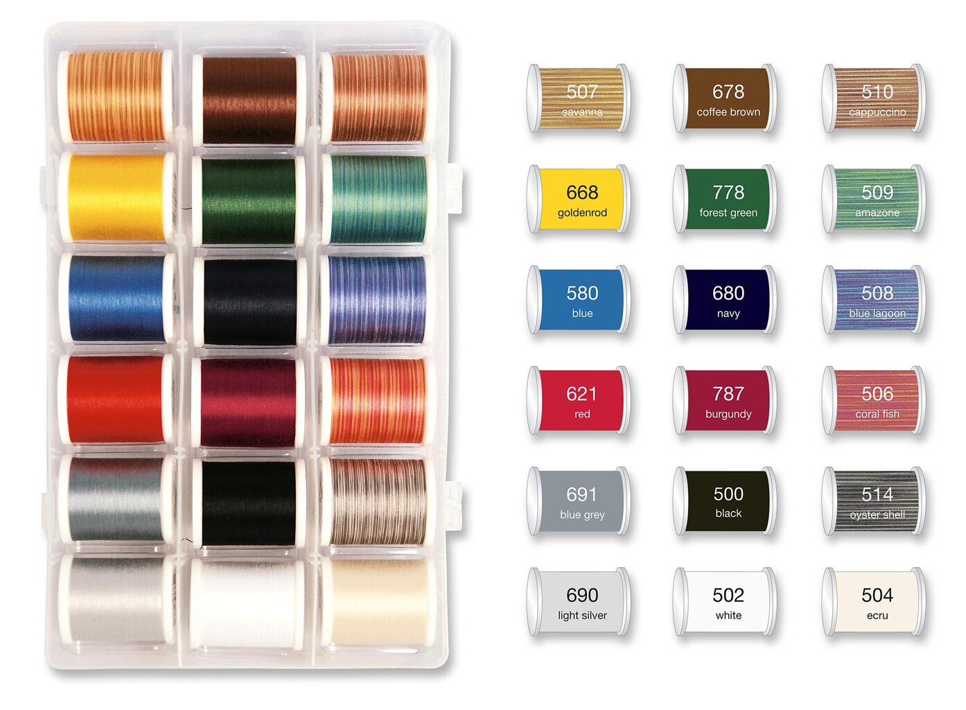 Praktický prenosný box, ktorý obsahuje 18 ks kvalitných vyšívacích nití Cotona 50 v návine 1000 ma sadu univerzálnych ihiel. Box ďalej obsahuje tlačenú farebnicu. Box je vyrobený z pevného priehľadného plastu.