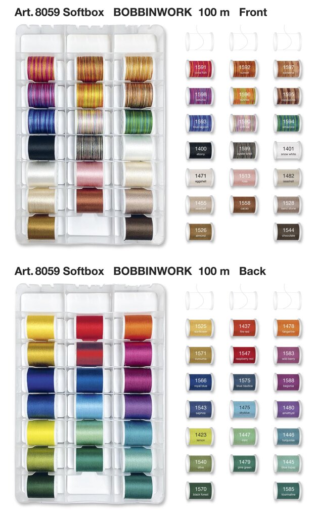Vyšívacie nite Madeira Bobbinwork (40x100m) je prenosný plastový box, ktorý obsahuje 40 ks silných vyšívacích nití Decora č.6 v návine 100 m.